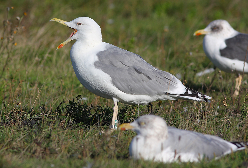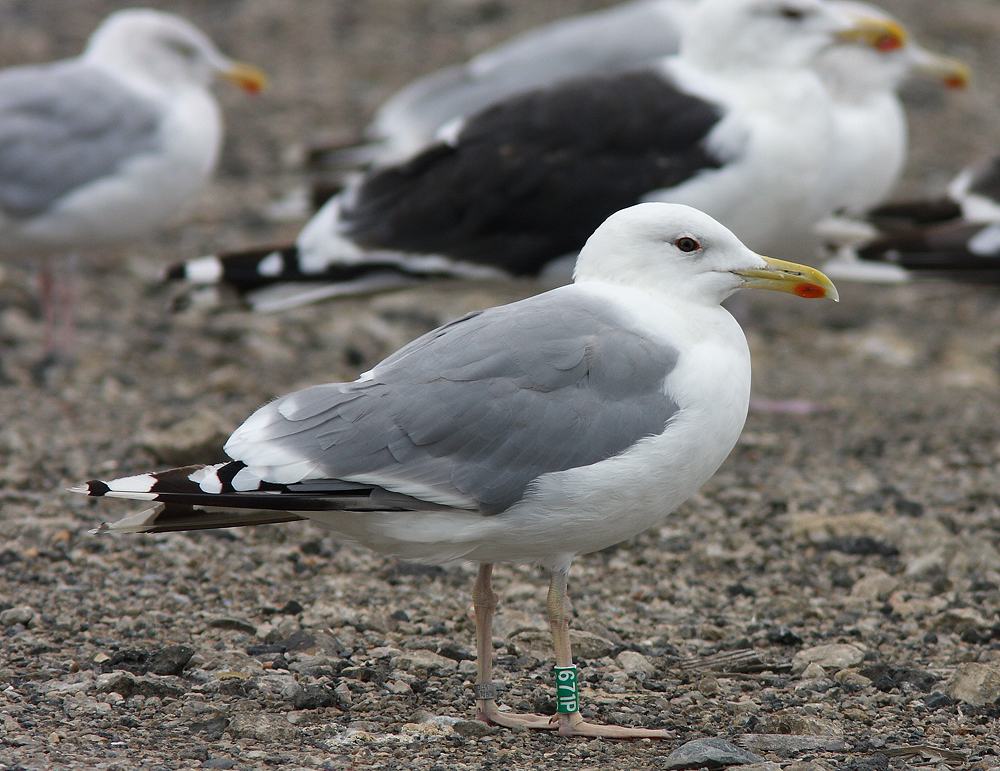 Larus cachinnans 6CY-8CY 671P October 2008, September & November 2010, Boulogne-sur-Mer, NW France, Picture: Jean-Michel Sauvage. Bird trapped at the nest, as breeding adult in a colony called "cachinnans-michahellis" in Poland. When birds are trapped as pullus, subsequent observations have to made to determine species. 671P green seems to be a fine cachinnans when grown up. Species: LARUS CACHINNANS/MICHAHELLIS (LARUS CACHINNANS/MICHAHELLIS) Photographie exceptionnelle car le pontique est un oiseau farouche. below: cachinnans 6CY 671P 18 October 2008. Moult score: P8/-. below: cachinnans 8CY 671P 11 September 2010. Moult score: P6/P9. Note missing central greater coverts, exposing secondaries underneath. below: cachinnans 8CY 671P 10 November 2010. Moult score: P9/-. |