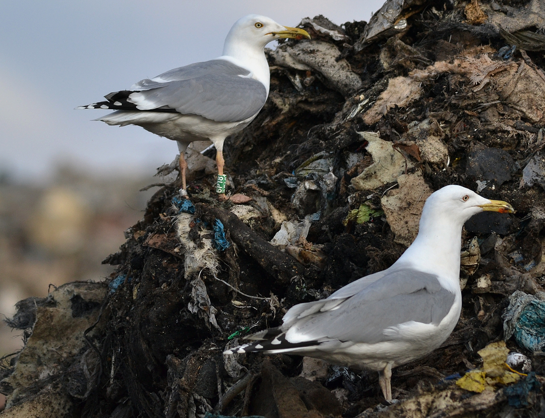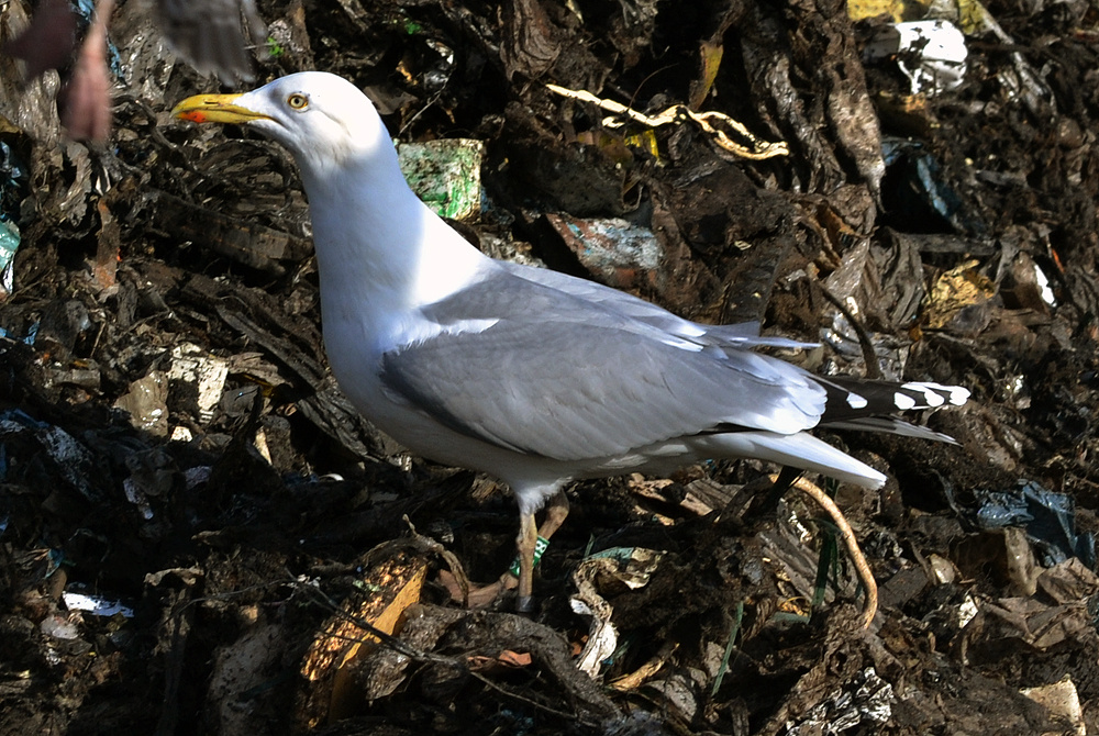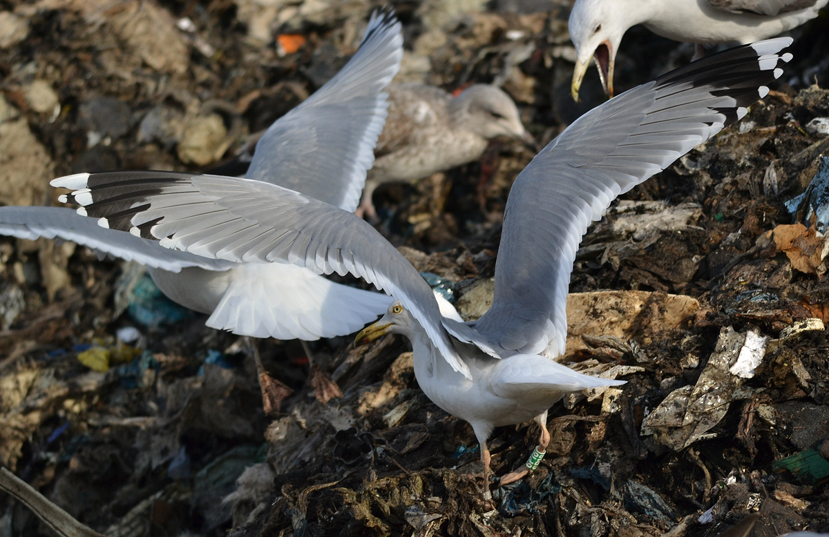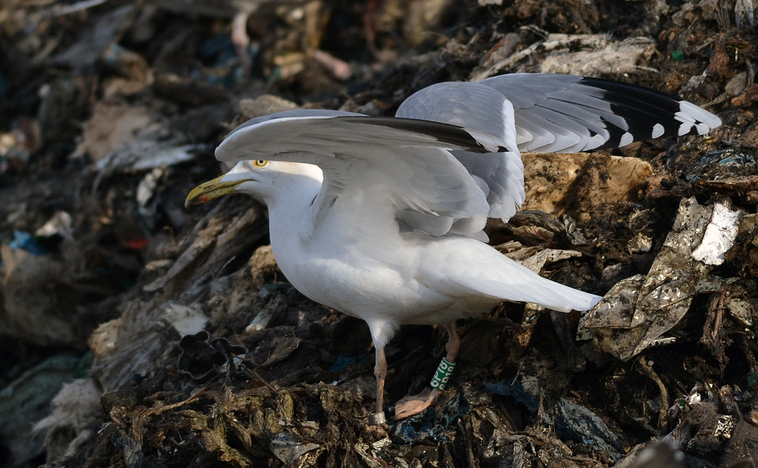 Larus cachinnans hybrid 9CY 6P18 February 09 2012, Deponie Pohlsche Heide - Minden, Germany (52°23'05N, 08°46'45E). Picture: Armin Deutsch. Green 6P18 and metal PLG DN-19170, ringed as pullus on May 13 2004 at Wloclawek, central Poland (52°39' N, 19°08' E). Caspian traits are long parallel bill and white tongue on underside of P10. In other respects much resembling Herring Gull (size of medial band on P10, broken band on P5, yellow staring eye, compact jizz). Recoveries: