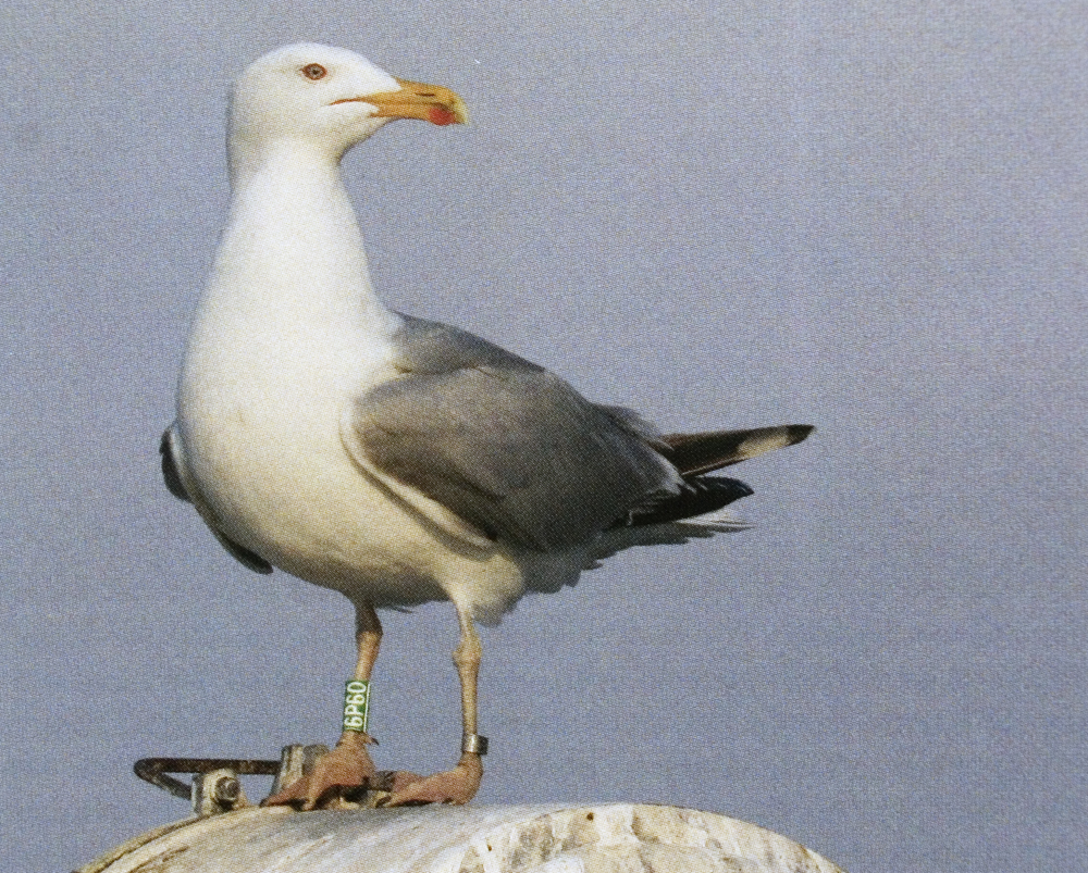 Larus cachinnans hybrid 5CY male 6P60 April 26 2008, Włocławek Reservoir, central Poland. Picture: Grzegorz Neubauer. 5CY backcross hybrid Caspian x Herring Gull, Wloclawek, central Poland, April 26 2008. Mother known as hybrid Caspian x Herring, father as Herring. Ringed as chick in Wloclawek on May 18 2004. This bird is inseparable from Herring: it retains a deep and short bill, short legs, and its bill coloration is intense.