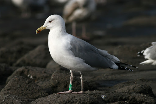 Larus cachinnans 6CY 7P37 October 28 2009, Westkapelle, the Netherlands. Picture: Pim Wolf. Green 7P37 and metal DN16663. Bird ringed in a mixed colony; ringed as pullus on May 23 2004 at Wisla Wloclawek Kujawsko, Poland. P10 almost fully grown. Full subterminal band on P5.