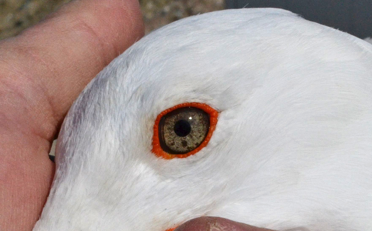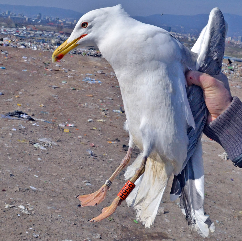 Larus cachinnans 956H adult, March 08 2015, Jakuševec-Zagreb, Croatia. Picture: ringing team Luka Jurinovic. Speckled iris. Red orbital ring. Full bands on P5-P9, mirror merged with tip on P10. Narrow medial band on P10.
