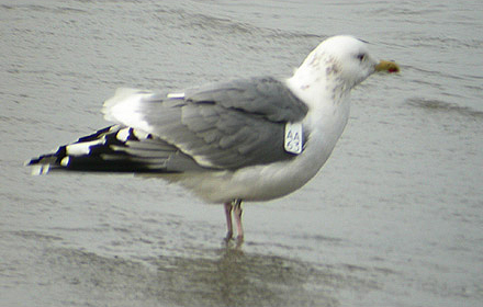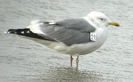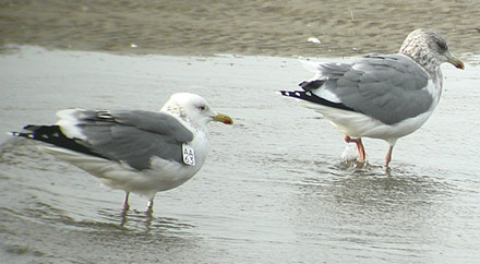 Larus (cachinnans) mongolicus AA63 adult, May 24 2004, Khökh Nuur, Mongolia & February 02 2006, Nakdong, S Korea. Please visit Birding Mongolia Blog for many more images! Ringed as sub-adult (5CY) AA63, ringed on May 24 2004, at Khökh Nuur (49°32'N, 115°31'E). below: mongolicus AA63 sub-adult, May 24 2004, Khökh Nuur, Mongolia. Picture: Thomas Langenberg. Note black in alula. In spring 2004 a German team of ornithologists coordinated by Andreas Buchheim ringed and wing-tagged a total of 170 adult (including a few subadults) Mongolian Gulls Larus mongolicus in north-eastern Mongolia. The major aim of this activity was to get information about migration routes and wintering grounds of this little-known taxon. Each bird was ringed with a metal band (issued by the German ’Helgoland Ringing Centre’) on its right tibia. To ensure specific and individual recognition the birds were additionally fitted with white wing tags showing an individual black four-character-code: the upper row consisting of two capital letters and the lower row of a two-digit number. below: mongolicus AA63 adult, February 02 2006, Nakdong estuary, S Korea. Picture: Nial Moores. Recorded in winter on February 02 2006 at Nakdong estuary, S Korea (35°03'N, 128°55'E) by Nial Moores, a distance of 1940 km. The photographs show how easily the wing tags can be seen by birders. |