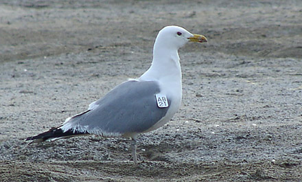 Larus (cachinnans) mongolicus AB21 adult, May 2004, NE Mongolia. Picture: Alfons Pennekamp. Please visit Birding Mongolia Blog for many more images! In spring 2004 a German team of ornithologists coordinated by Andreas Buchheim ringed and wing-tagged a total of 170 adult (including a few subadults) Mongolian Gulls Larus mongolicus in north-eastern Mongolia. The major aim of this activity was to get information about migration routes and wintering grounds of this little-known taxon. Each bird was ringed with a metal band (issued by the German ’Helgoland Ringing Centre’) on its right tibia. To ensure specific and individual recognition the birds were additionally fitted with white wing tags showing an individual black four-character-code: the upper row consisting of two capital letters and the lower row of a two-digit number. |