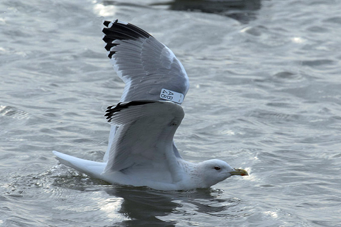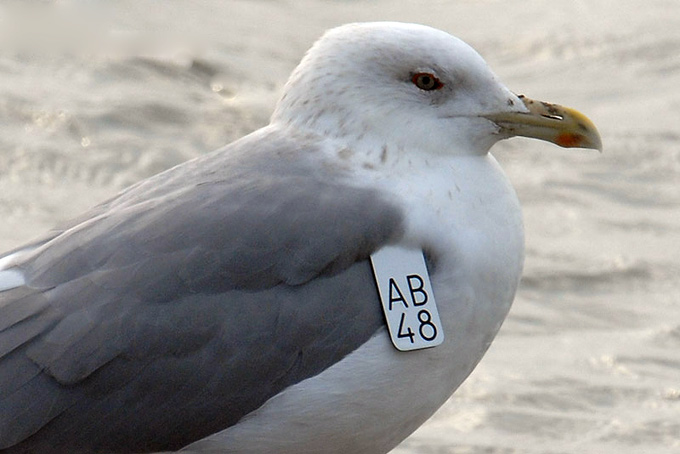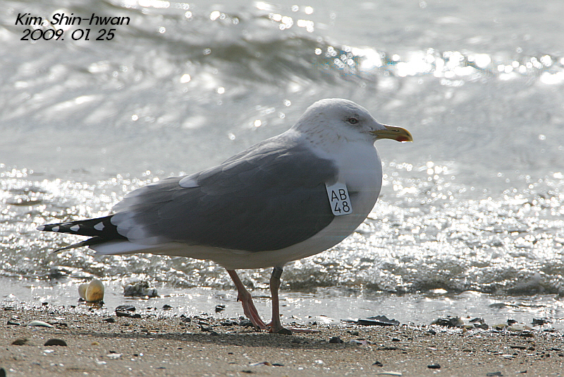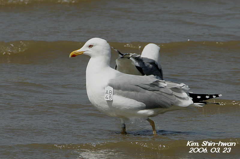 Larus (cachinnans) mongolicus AB48 adult, November 11 2007, Hongsong Chungnam, S Korea (36°32'N, 126°28'E). Picture: Kim Hyun-tae. Please visit Birding Mongolia Blog for many more images! Wing-tagged Mongolian Gull AB48 and metal DEH 4059948. It was ringed as 5CY on May 27 2004 at Khökh Nuur (49°32'N, 115°31'E, picture below). In spring 2004 a German team of ornithologists coordinated by Andreas Buchheim ringed and wing-tagged a total of 170 adult (including a few subadults) Mongolian Gulls Larus mongolicus in north-eastern Mongolia. The major aim of this activity was to get information about migration routes and wintering grounds of this little-known taxon. Each bird was ringed with a metal band (issued by the German ’Helgoland Ringing Centre’) on its right tibia. To ensure specific and individual recognition the birds were additionally fitted with white wing tags showing an individual black four-character-code: the upper row consisting of two capital letters and the lower row of a two-digit number. The wing tagged Mongolian Gull AB48 has been recorded and photographed on two occasions at Hongsong Chungnam province (36°32'01.63"N 126°28'47.17"E).