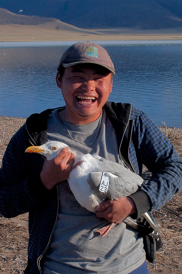 Larus (cachinnans) mongolicus AJ23 adult, June 2012, Khar Us Nuur, Mongolia (49°32'N, 115°31'E). Picture: Andreas Buchheim. Wing-tagged mongolicus AJ23 ready to release, with Tuvshin. |