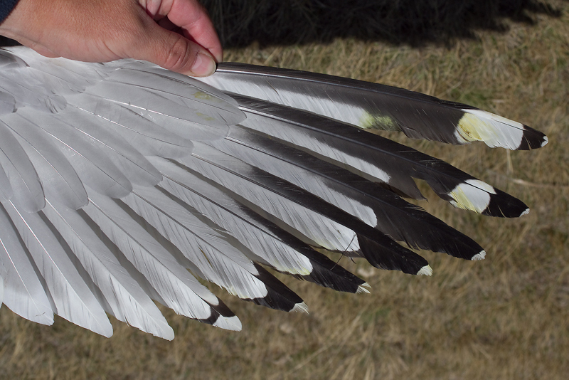 Larus (cachinnans) mongolicus AL54 adult, May 26-28 2013, Telmen Nuur, Mongolia (48°49'N, 97°10'E). Picture: Andreas Buchheim. Please visit Birding Mongolia Blog for many more images! Adult bird, trapped in NE Mongolia. Mongolicus adult AL54. Wingtip: White mirror well separated from small white tip, by broad sub-terminal black band. Long pale tongue on P10, leaving narrow medial band (medial band about equal to length of mirror+tip). Mirror on both webs of P9. Full band on P5 and on P4. No 'white moons', no white tongue tips on P6-P8. Moult score: P1-P10 present, PMS=0. |