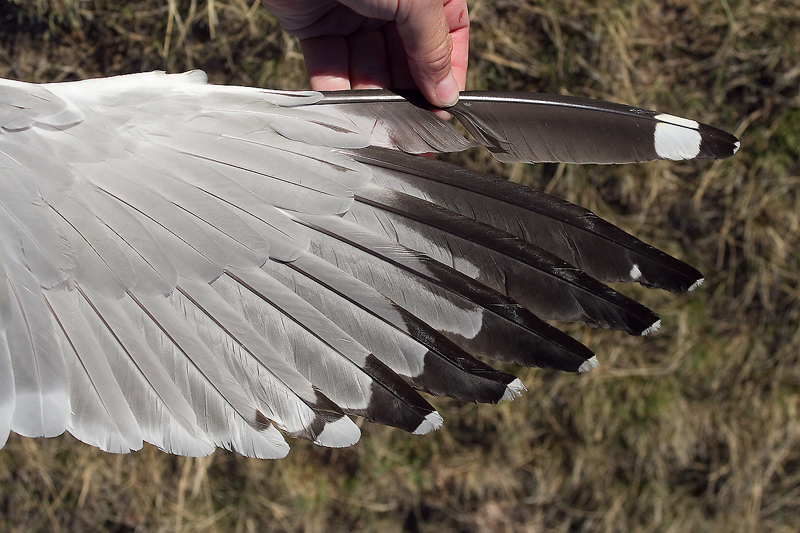 Larus (cachinnans) mongolicus AL64 adult, May 26-28 2013, Telmen Nuur, Mongolia (48°49'N, 97°10'E). Picture: Andreas Buchheim. Please visit Birding Mongolia Blog for many more images! Adult bird, trapped in NE Mongolia. Mongolicus adult AL64. Note black on greater primary coverts, but such well defined, sharply bordered markings are probably also found in mature birds. Wingtip: Much black. White mirror well separated from small white tip, by broad sub-terminal black band. Short pale tongue on P10, just visible below primary coverts. Tiny mirror on inner web of P9. Full band on P5 and on P4, black spot on P3. No 'white moons', no white tongue tips on P6-P8. Moult score: P1-P10 present, PMS=0. |
