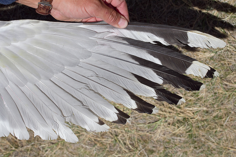 Larus (cachinnans) mongolicus AN15 adult, June 2013, Mongolia. Picture: Andreas Buchheim. Please visit Birding Mongolia Blog for many more images! Adult bird, trapped in NE Mongolia. Mongolicus adult AN15. Wingtip: Much white. White mirror merges with white tip, no sub-terminal band. Long pale tongue on P10, leaving narrow medial band (medial band smaller than length of mirror+tip). Large mirror on both webs of P9. Full band on P5, black spot on P4. No 'white moons', no white tongue tips on P6-P8. Moult score: P1-P10 present, PMS=0. |