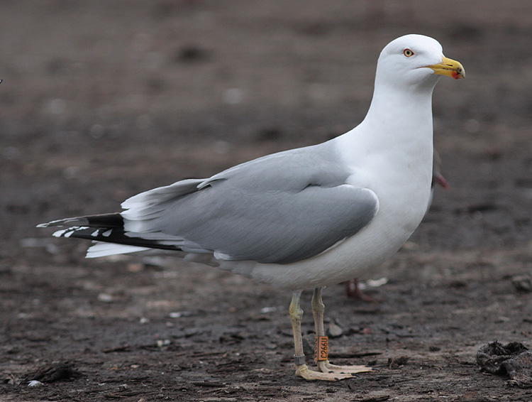 Larus argentatus argentatus 7CY C266U April 12 2008, Tara dump - Tampere, Finalnd. Foto: Hannu Koskinen. Ringed as pullus in 2002, S Finland. Bird with yellow legs. This represents a potential cachinnans-trap for the unwary. Baltic Herrings commonly have a complete black band across P5, a long white tip to P10, yellowy legs and a reddish orbital ring; its bill is rather slender-based and its upperparts are a good match for cachinnans. However, the head retains the typical bulk of Herring Gull, its iris is unmarked yellow, and the bill has a rather sharply curved culmen and a marked gonydeal angle. |