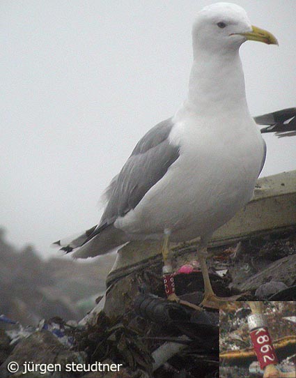 Larus cachinnans adult K862 February 04 2006, Leipzig, Germany. Picture: Jürgen Steudtner. Ringing data pending, probably ringed on June 20 1999 in a mixed colony (Larus argentatus - complex) at Snudy Lake, Lakino Island, Braslav district, Vitebsk region, Belarus (55.46'N 27.03'E). |