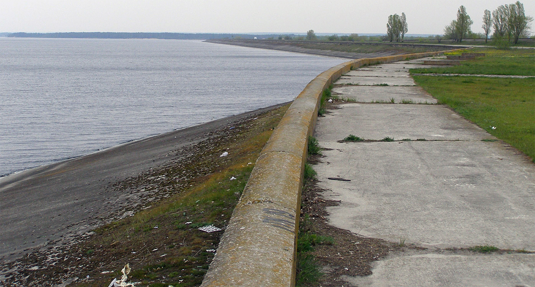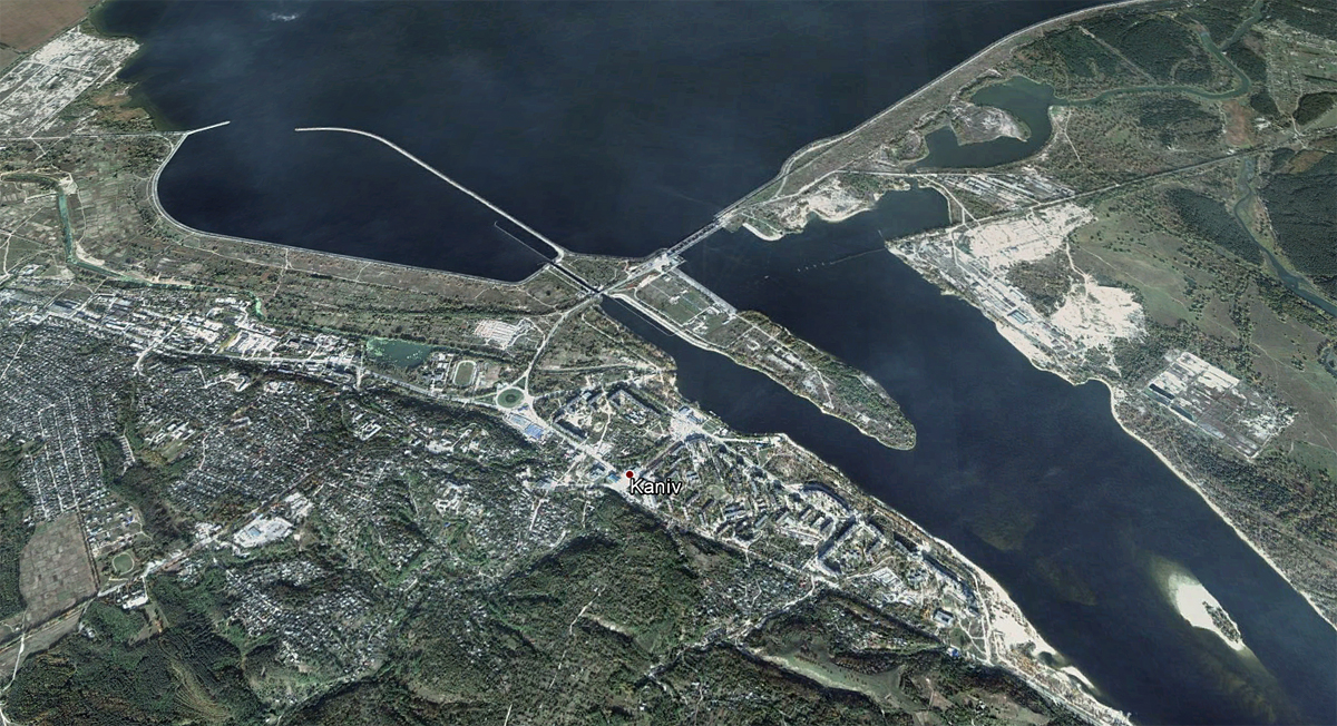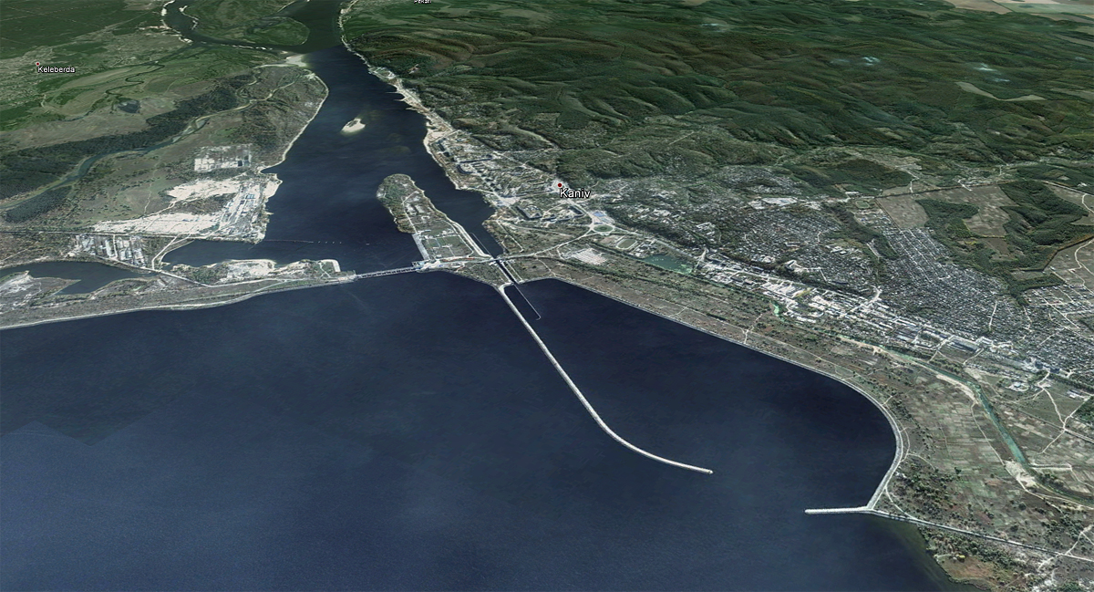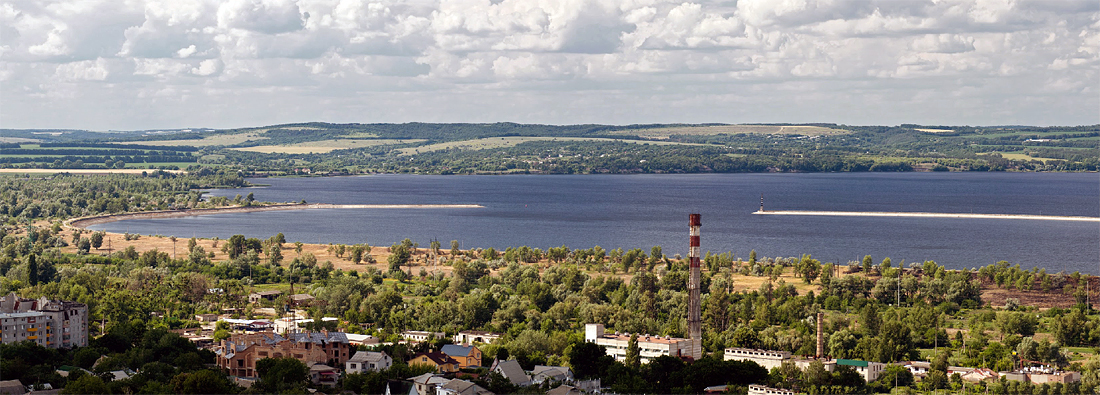 Dnjepr reservoir Kaniv (49,45,46N 31,27,52E). Pictures from Panoramio (often users with nicknames). The town of Kaniv, with large scale dam constructions; breeding site for many ringed Caspian Gulls recorded in Europe. This is merely a "ringers effect", as Caspian Gulls are well distributed along the entire Dnjepr river systems and basin, yet birds are ringed at just a few locations. below: looking from north to south over the reservoir. |
