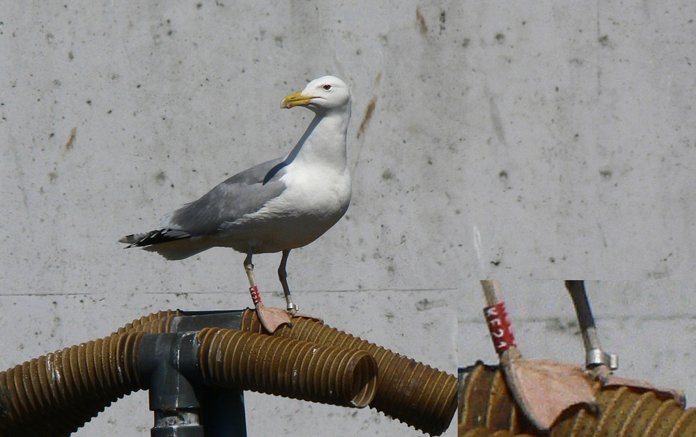 Larus argentatus? 7CY KE21 May 04 2012, Gatovo - Minsk district, Belarus. Picture: Dmitry Goncharov. Bird ringed red KE21 and BYM DA-03110, ringed as pullus on June 07 2006 at Gatovo - Minsk district, Belarus, (53.47'00''N, 027.40'00''E). Again in the mixed rooftop breeding colony in Minsk, with breeding cachinnans, argentatus and fuscus. Speckled iris, bill with obvious gonys angle and wingtip pattern not visible. |
