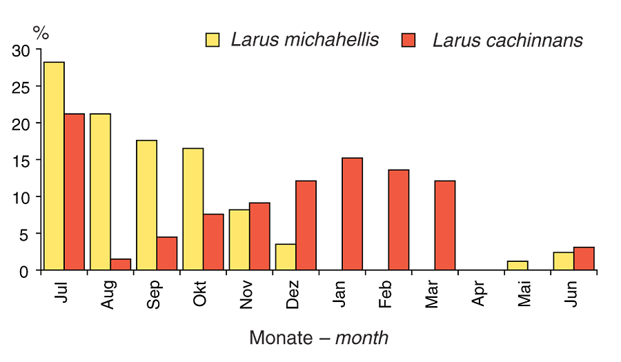 Influxes of Caspian Gulls Larus cachinnans and Yellow-legged Gulls L. michahellis into northern Central Europe – origin, causes, course and trend. Fig. 1: Seasonal distribution of ring identifications of Caspian and Yellow-legged Gulls in Northern Poland (1991–2004; n = 150). |