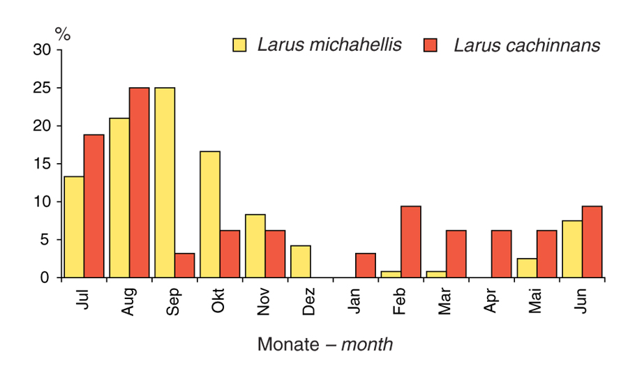 Influxes of Caspian Gulls Larus cachinnans and Yellow-legged Gulls L. michahellis into northern Central Europe – origin, causes, course and trend. Fig. 2: Seasonal distribution of ring identifications of Caspian and Yellow-legged Gulls at the German Baltic coast (1991–2004; n = 152). |