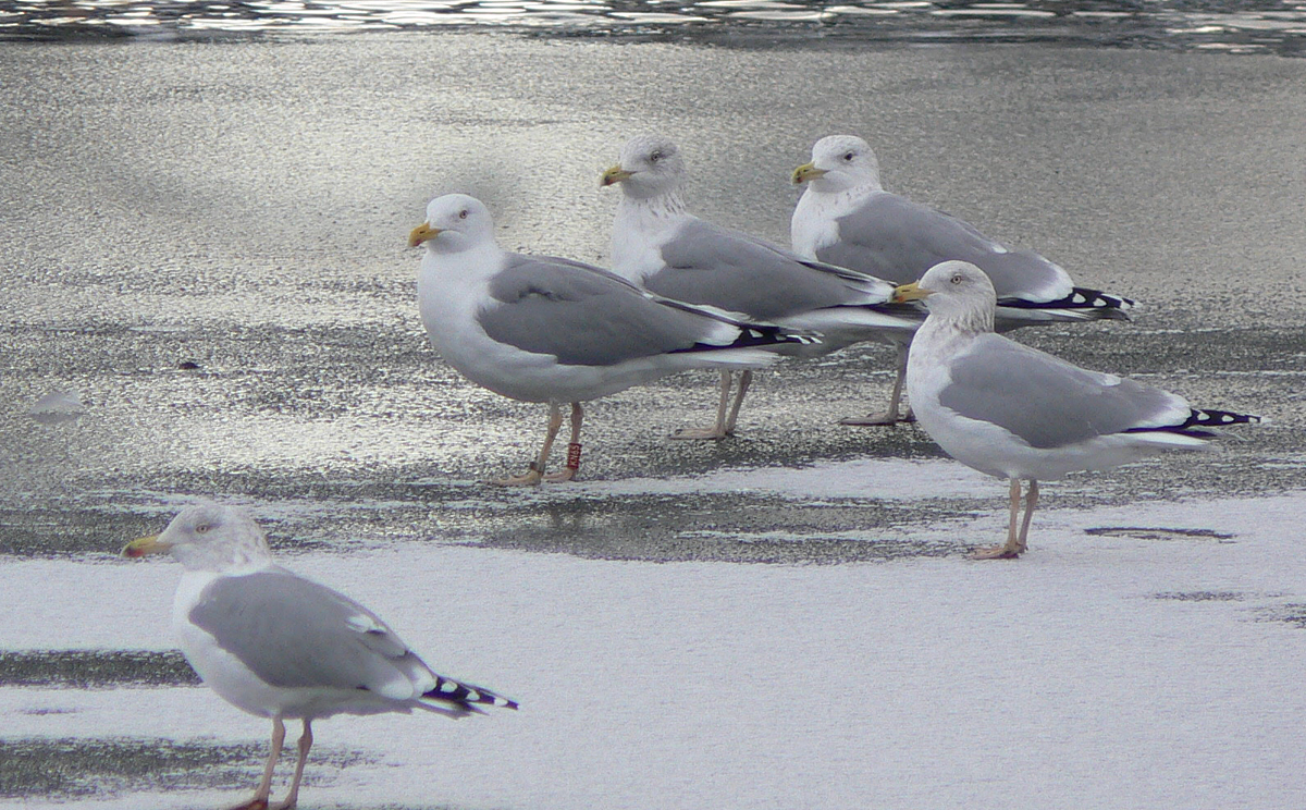 Larus argentatus? 6CY KN65 January 17 2012, Svisloch River, Minsk, Belarus (53°54'44.41"N, 27°32'57.03"E). Picture: Dmirty Goncharov. Red KN65 ringed as pullus on June 07 2007, at a colony in a swamp "Yelnya", Vitebsk region, Miory district, Belarus (55o.30'00''N, 027o.48'00''E). Ringer N. Yakovets. Bill and head structure within limits of argentatus. Could be hybrid, hatched in mixed colony and parents unknown. |