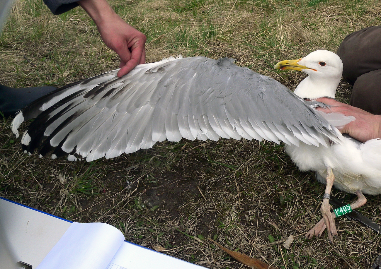 Larus cachinnans P405 sub-adult, April 20 2012, Wytyckie Lake - Urszulin, Poland. Picture: Łukasz Bednarz ringing team. Please visit Łukasz's BLOG for beautiful drawings and up-to-date gull news from eastern Poland: Wildlife art and illustration For 2012, breeding location of 150 pairs cachinnans, of which 54 adults ringed and 158 pulli in 2012 (pers comm. Łukasz Bednarz). Breeding bird trapped at the nest. Sub-adult bird, probably 5CY. |