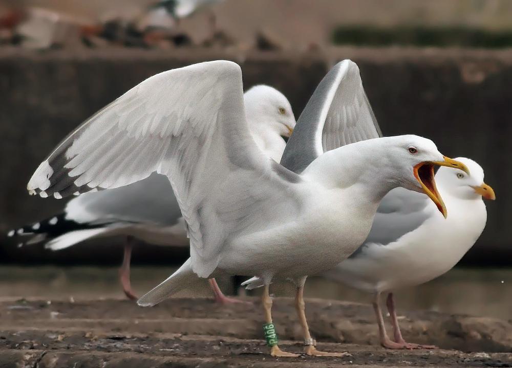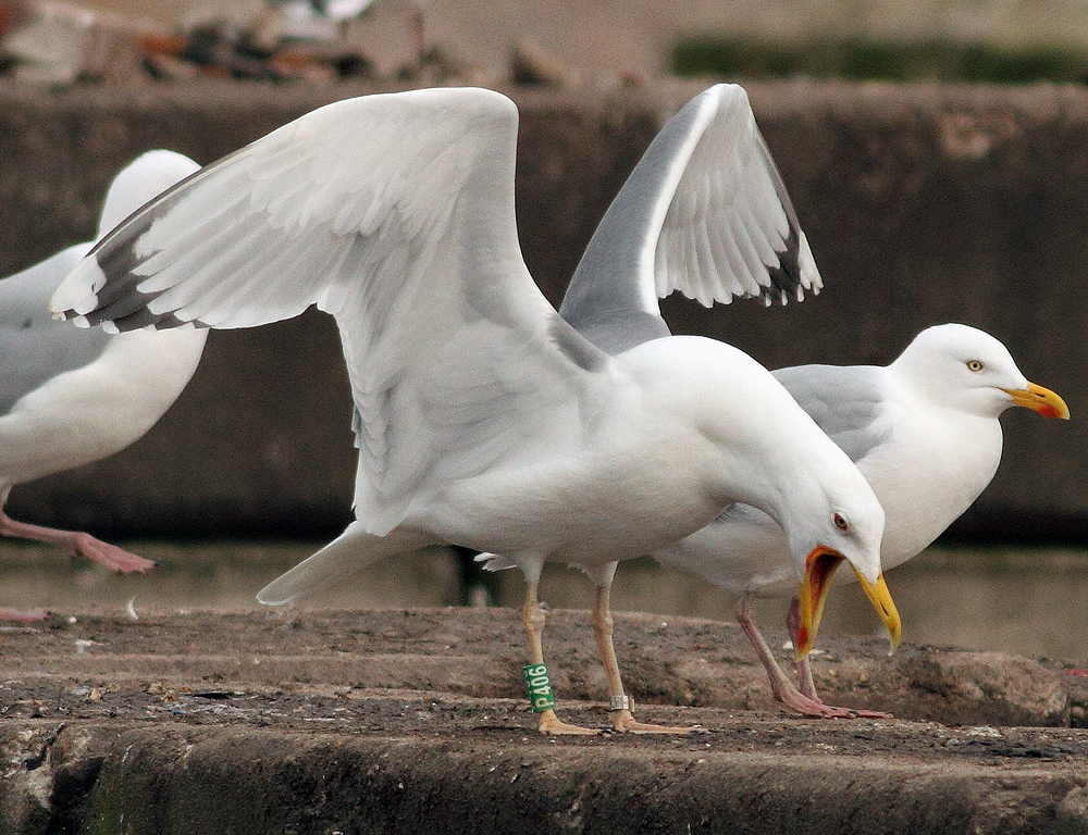 below: Larus argentatus sensu lato P406 adult, February 18 2013, Barneveld, the Netherlands. Picture: Herman Bouman. Albatros pose when aggitated.
