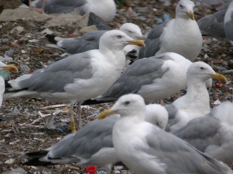 Larus cachinnans adult PABE July 30 2010, Lubna, Poland. Picture: Michal Rycak. Yellow PABE, ringed May 02 2009 in breeding colony as female >3CY, in Poland ZB.KOZIELNO, PACZKÓW, OPOLSKIE, POLSKA, 50°29'N, 16°58'E. Ringer Jacek Betleja. An example bird of pale-eyed cachinnans. For Romania, Lou Bertalan reports: "concerning pale irises: out of 150 adult cachinnans photographed in Romania 30% have "pale" irises, 51% "medium" pigmented and only 19% "dark" ones. This is a count I just made from my collected photos and of course many are not straight in one category but i think the relation is somewhere there!". |