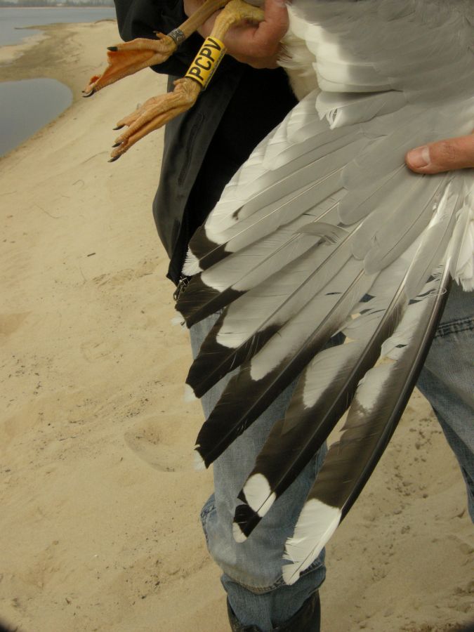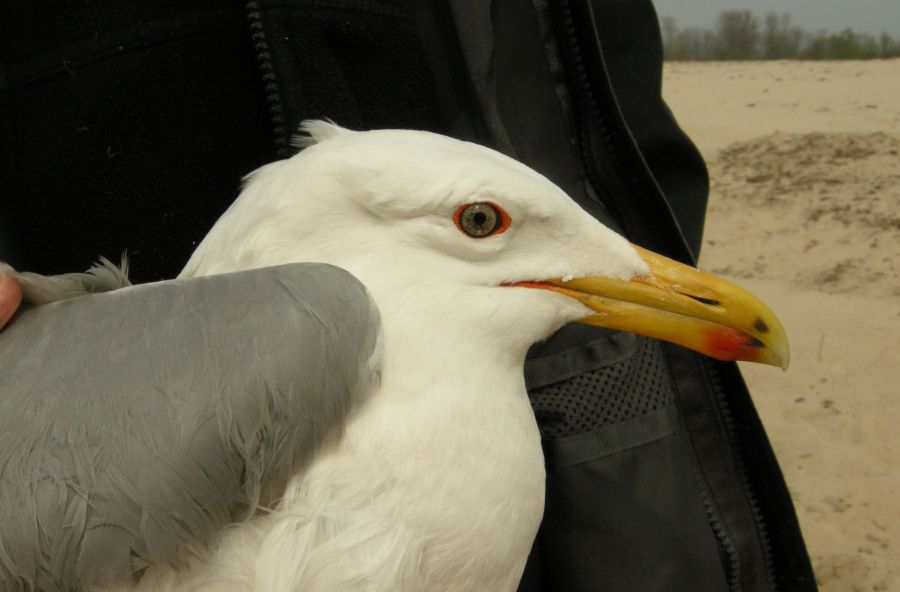 Larus cachinnans adult PCPV April 20 2011, Kozielno Paczkow Opolskie Poland. Picture Michal Rycak. Yellow PCPV probably male. Ringed as adult breeding at the nest on April 20 2011, at Kozielno Paczkow Opolskie Poland (50,48333 16,96667). Local breeding colony of 121 nest of large gulls; most (80-90%) cachinnans looking birds. PCPV has a short and high bill, speckled iris, tongue on P10, full band on P5 and small black spot on P4.
