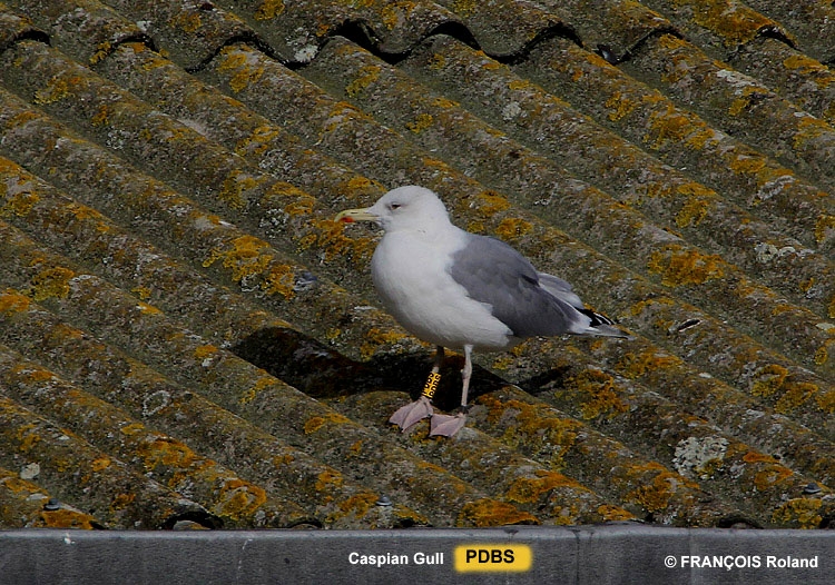 Larus cachinnans adult female PDBS October 24 2010, Oostende, Belgium. Picture: Roland Francois. Yellow PDBS and metal PLG DN-18534; ringed as breeding female at the nest on May 01 2010, at Kozielno Paczkow Opolskie Poland (50,483333 16,966667). Note rounded head in female. |