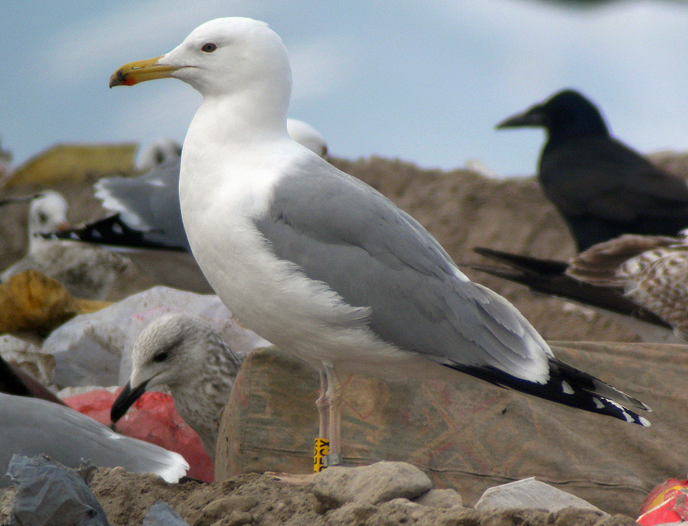 Larus cachinnans adult PECX 19 February 2012, Zagreb, Croatia. Picture: Ruud Altenburg. Bird ringed yellow PECX & metal PLG DN-18825, ringed as breeding adult at the nest April 28 2001, at Kozielno Paczkow Opolskie POLAND (50,48333; 16,96667), near the border with the Czech Rupublic. Moderately peppered iris, broad bill-band, medial black not as broad as white wing-tip, long tongue at P10. |