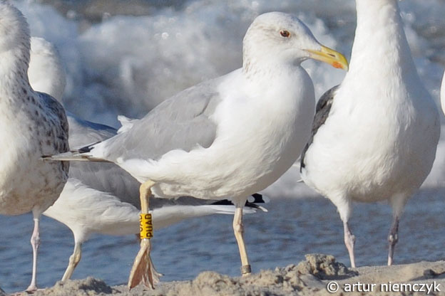 Larus cachinnans adult PUAD October 17 2011, Krynica Morska, Poland. Picture: Artur Niemczyk. Yellow PUAD, probably ringed as breeding adult at the nest in May-June 2010 at Kanev reserve Balyko-Schuchinka, Ukraine. Long legs, dark iris and slim bill. |