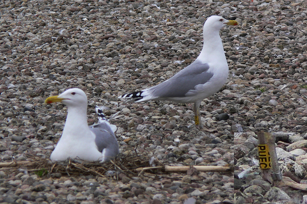 Larus cachinnans adult PUEC April 25 2012, Gatovo - Minsk, Belarus. Picture: Dmitry Goncharov. Bird ringed yellow PUEC and UKK L-009424, ringed as breeding adult male at the nest on May 19 2010 at Chernihiv Kosachivka Kyiv res Ukraine (51,1 30,95). Now in the rooftop breeding colony in Minsk. Ringed as adult male in Ukraine, but if the birds in the picture form a pair, the bird on the nest should be labelled male, as it has much stronger proportions. |