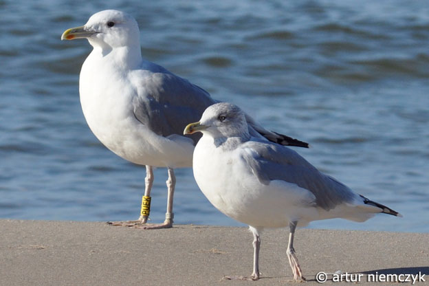 Larus cachinnans adult PUEK October 17 2011, Krynica Morska, Poland. Picture: Artur Niemczyk. Yellow PUEK (& UKK L-009429?), probably ringed as breeding adult at the nest on May 19 2010 at Chernihiv Kosachivka Kyiv reservoir Ukraine (51,1 30,95). Short looking legs, dark iris and slim bill. P8 fully grown, P9 tip just visible in far wing. |