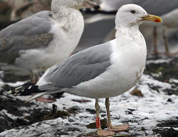 Larus cachinnans 11CY female U738 February 02 2004, Berlin, Germany. Picture: Ronald Klein. Red K793, ringed as pullus on June 03 1994 at Konsky island Cherson Ukraine (46,401 32,05 ). Female Caspian Gull from near the Black Sea. |