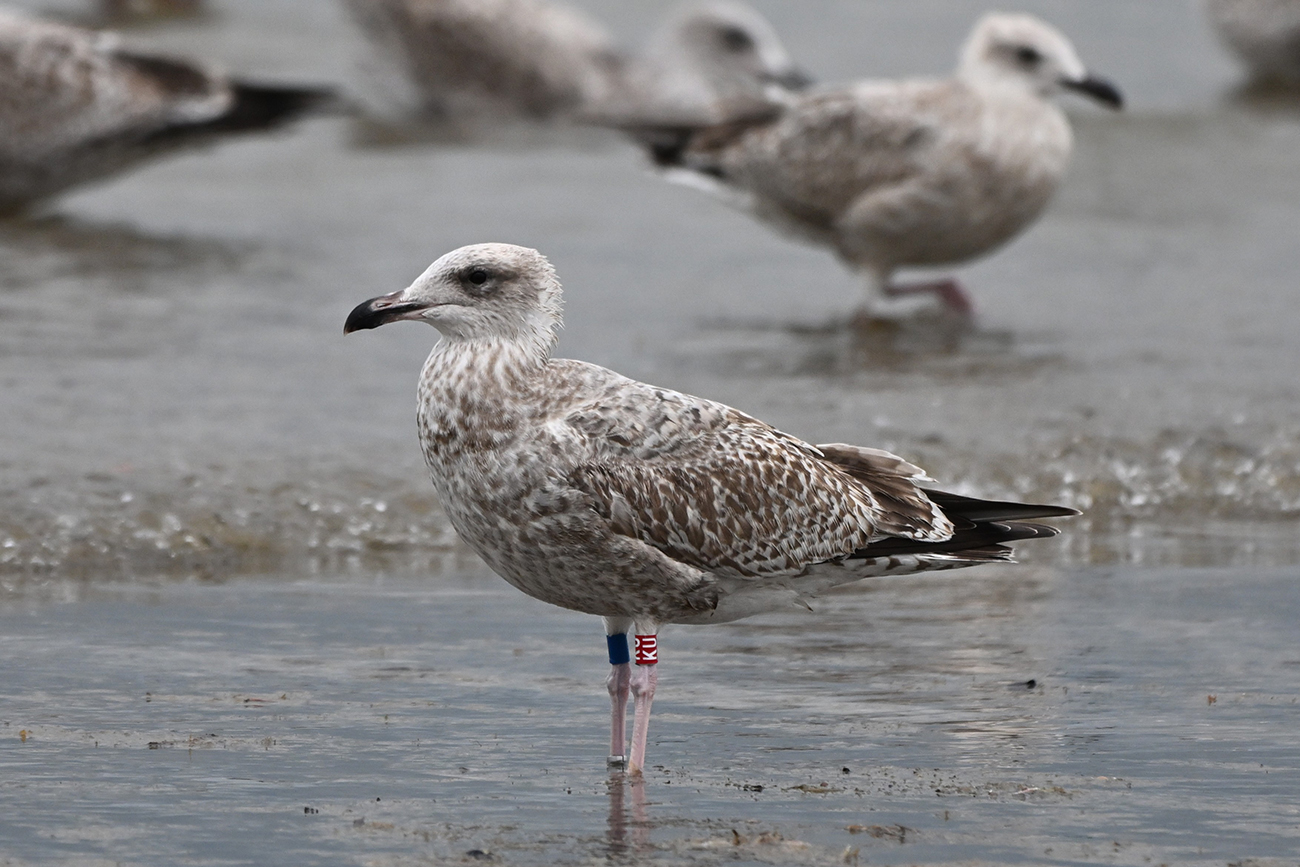 below: Herring Gull argenteus B / KU 1CY, October 08 2025, IJmuiden, the Netherlands. Picture: Thijs Horst.