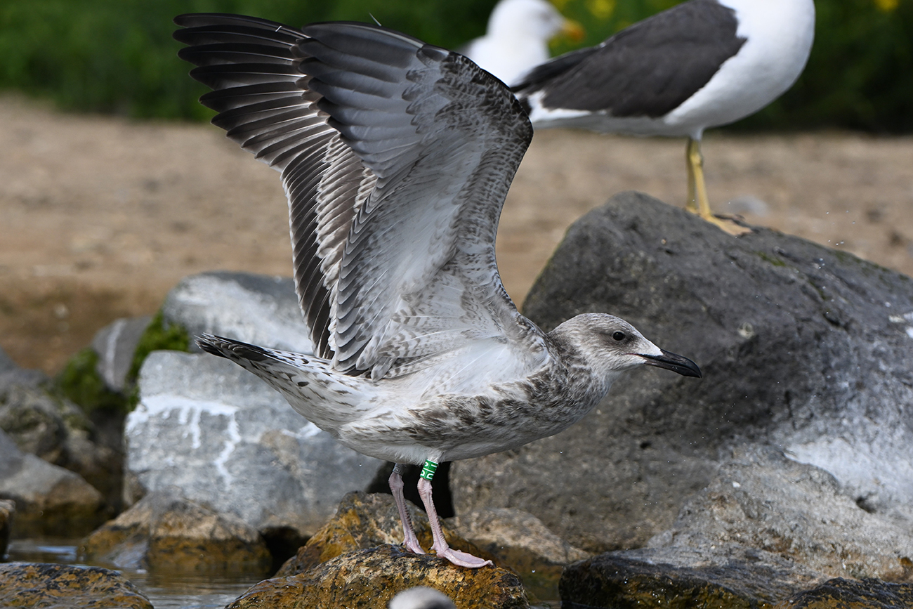 below: Caspian Gull cachinnans D|J 1CY, July 18 2025, colony De Kreupel, the Netherlands. Picture: Thijs Horst & Mars Muusse.