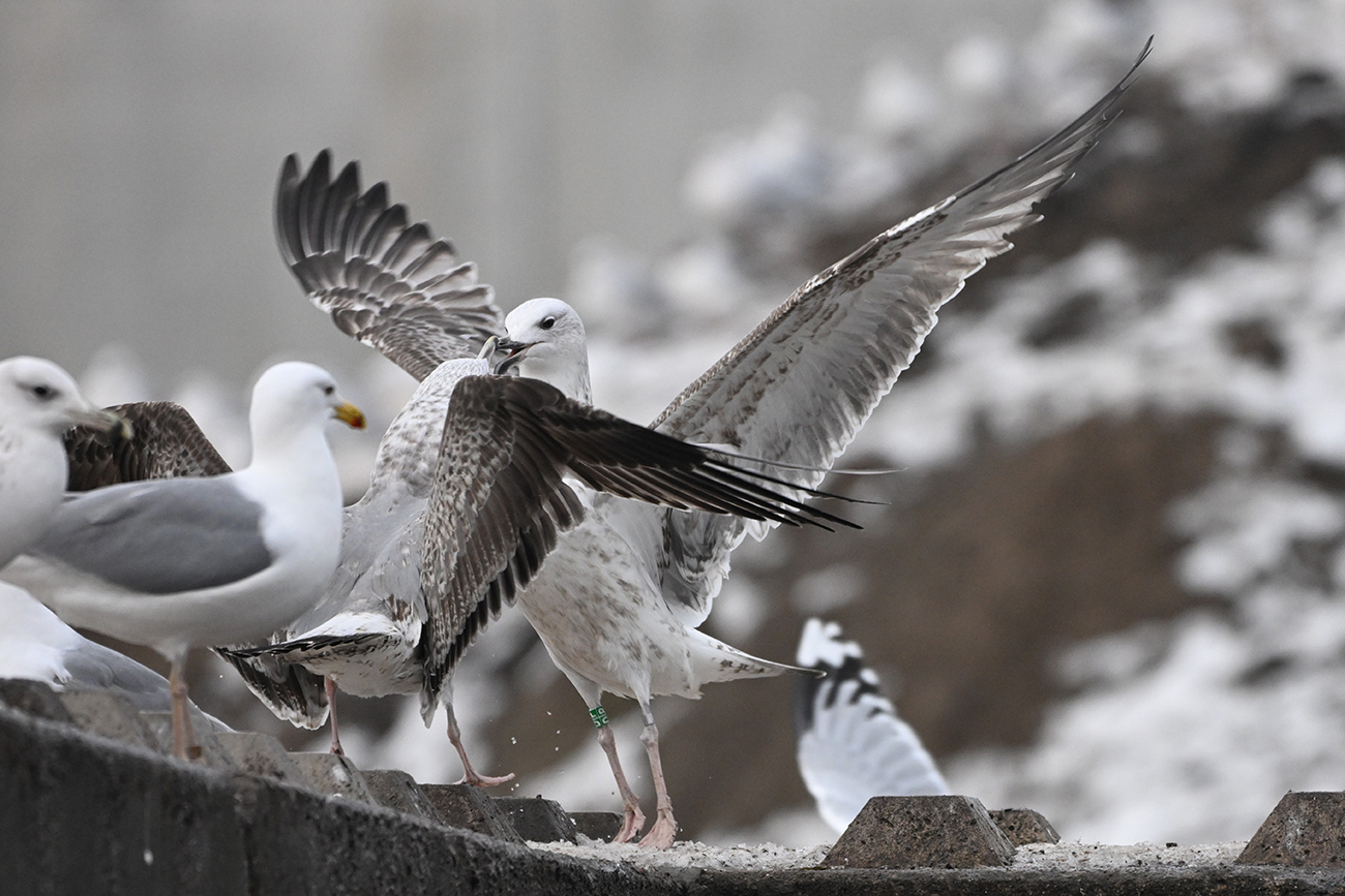 below: Caspian Gull cachinnans D|P 1CY, November 01 2024, IJmuiden, the Netherlands. Picture: Mars Muusse.