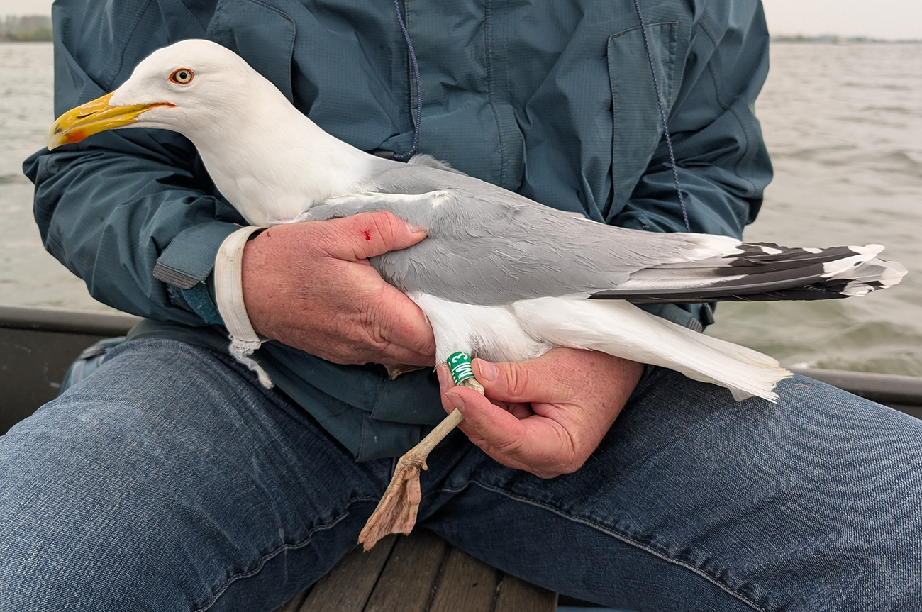Tibia G-M|3 and metal NLA 5.641.004, ringed as breeding adult Larus cachinnans on April 23 2025 at Lelystad, the Netherlands. Ringed by Roland-Jan Buijs ringing team (Mars Muusse / Thijs Horst / Fred Cottaar).