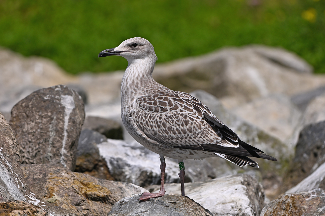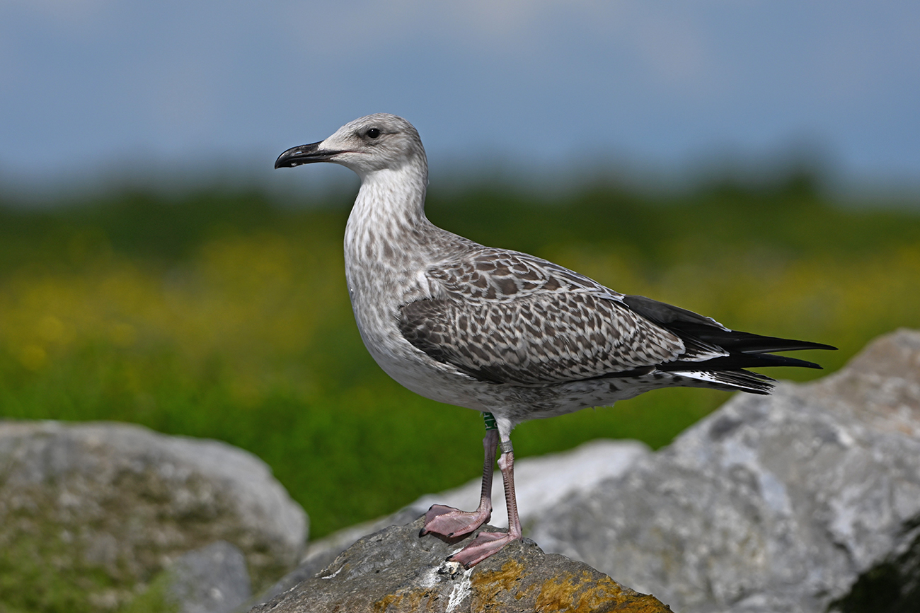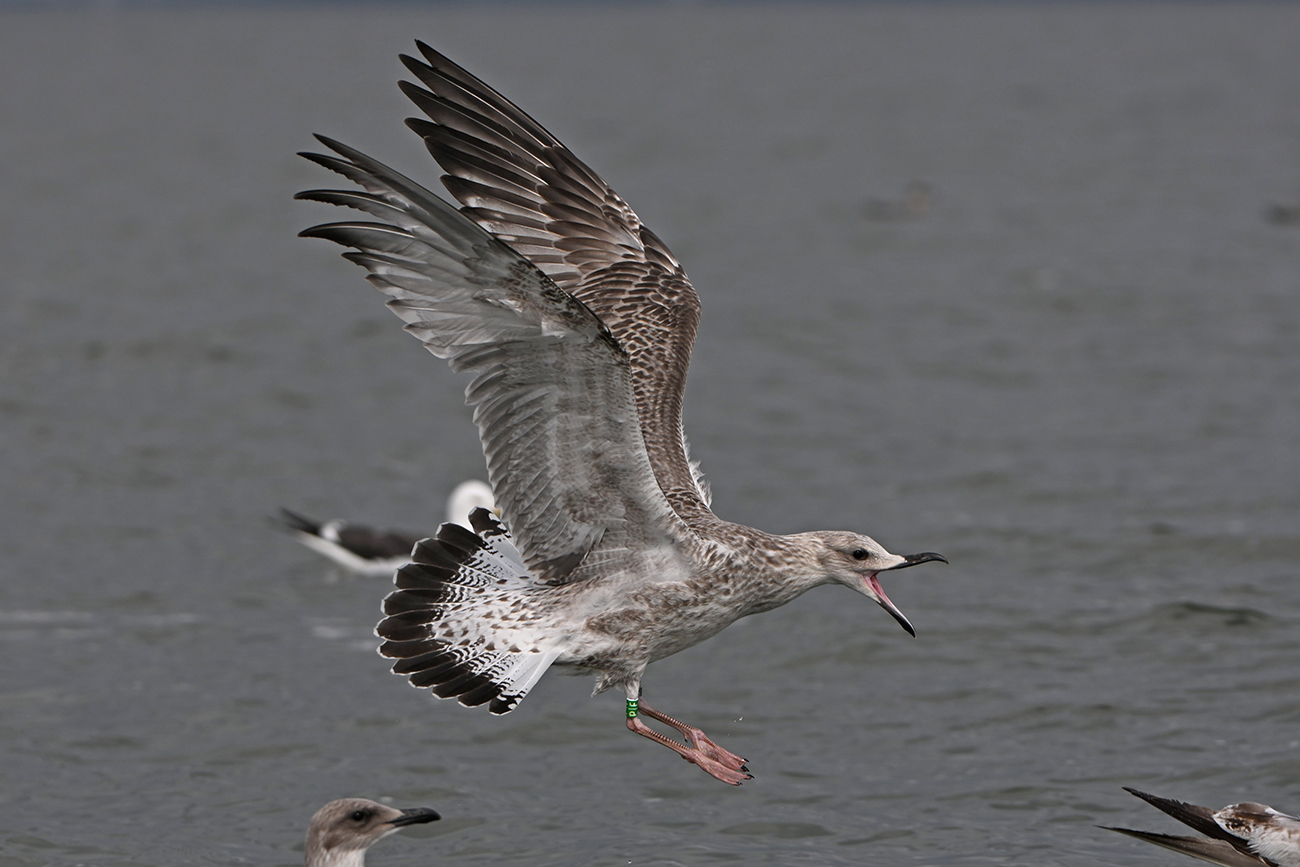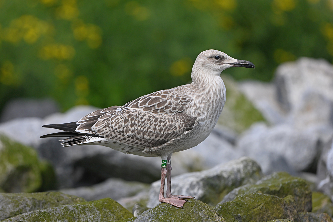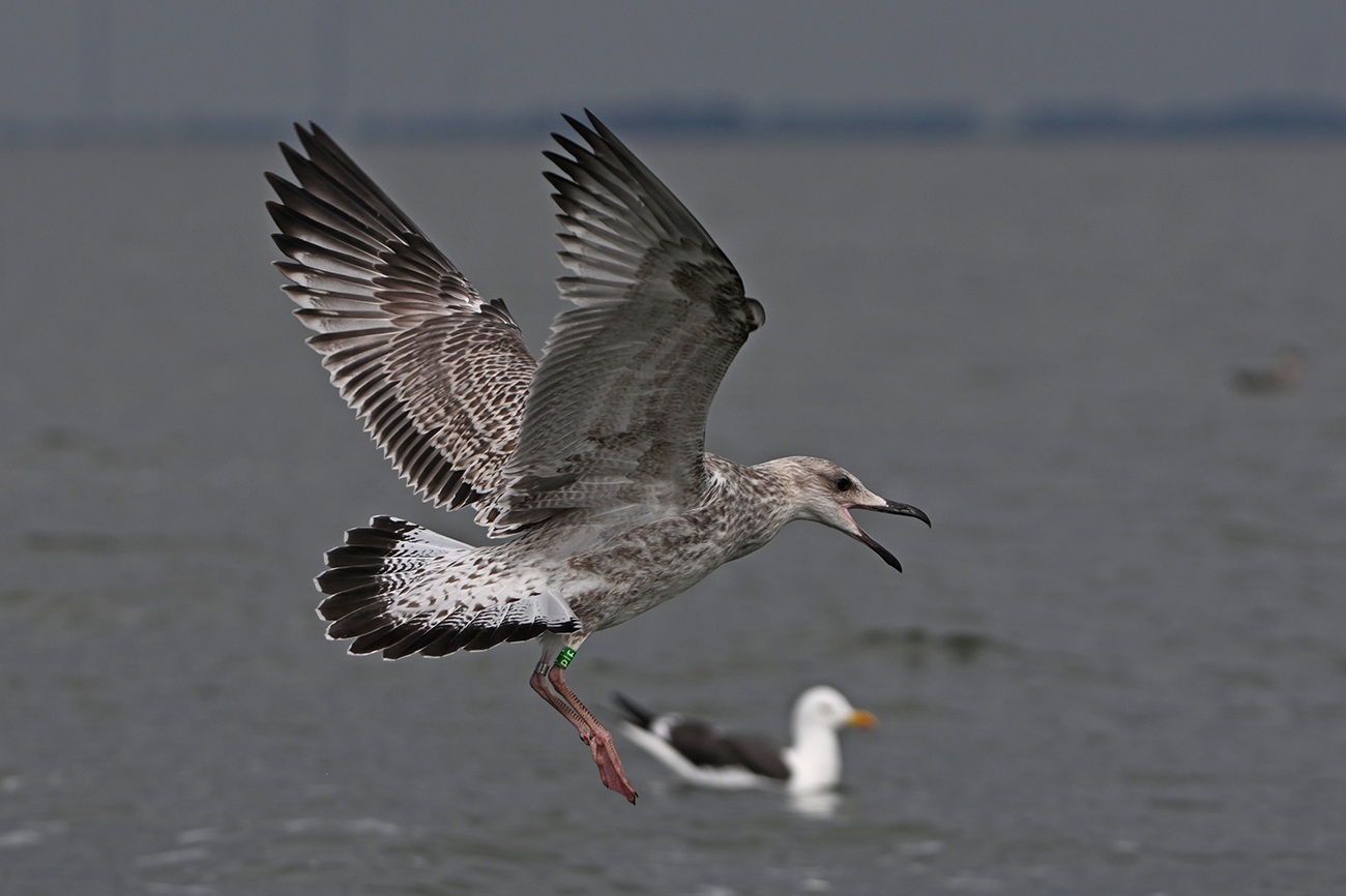 Tibia G-P|F and metal NLA 5.639.036, ringed as pullus Larus cachinnans on May 09 2025 at IJsselmeer (De Kreupel), Noord-Holland, by ringer Leon Kelder.
