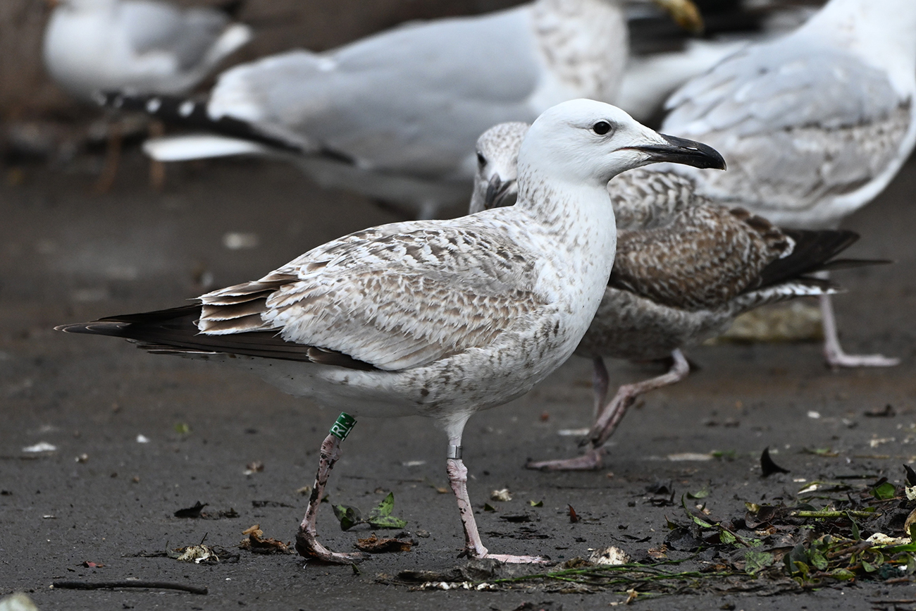 below: Caspian Gull cachinnans R|J 1CY, May 31 2025, colony Lelystad, the Netherlands. Picture: Thijs Horst.
