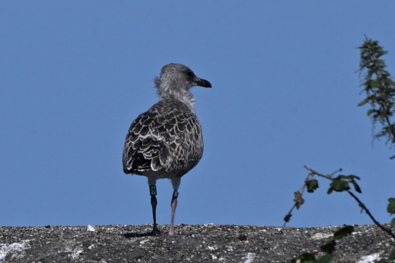 Tibia G-R|X and metal NLA 5.641.919, ringed as pullus F1 hybrid Larus cachinnans x argentatus hybrid on May 31 2025 at Lelystad, the Netherlands. Ringed by Roland-Jan Buijs ringing team (Mars Muusse / Thijs Horst / Fred Cottaar).