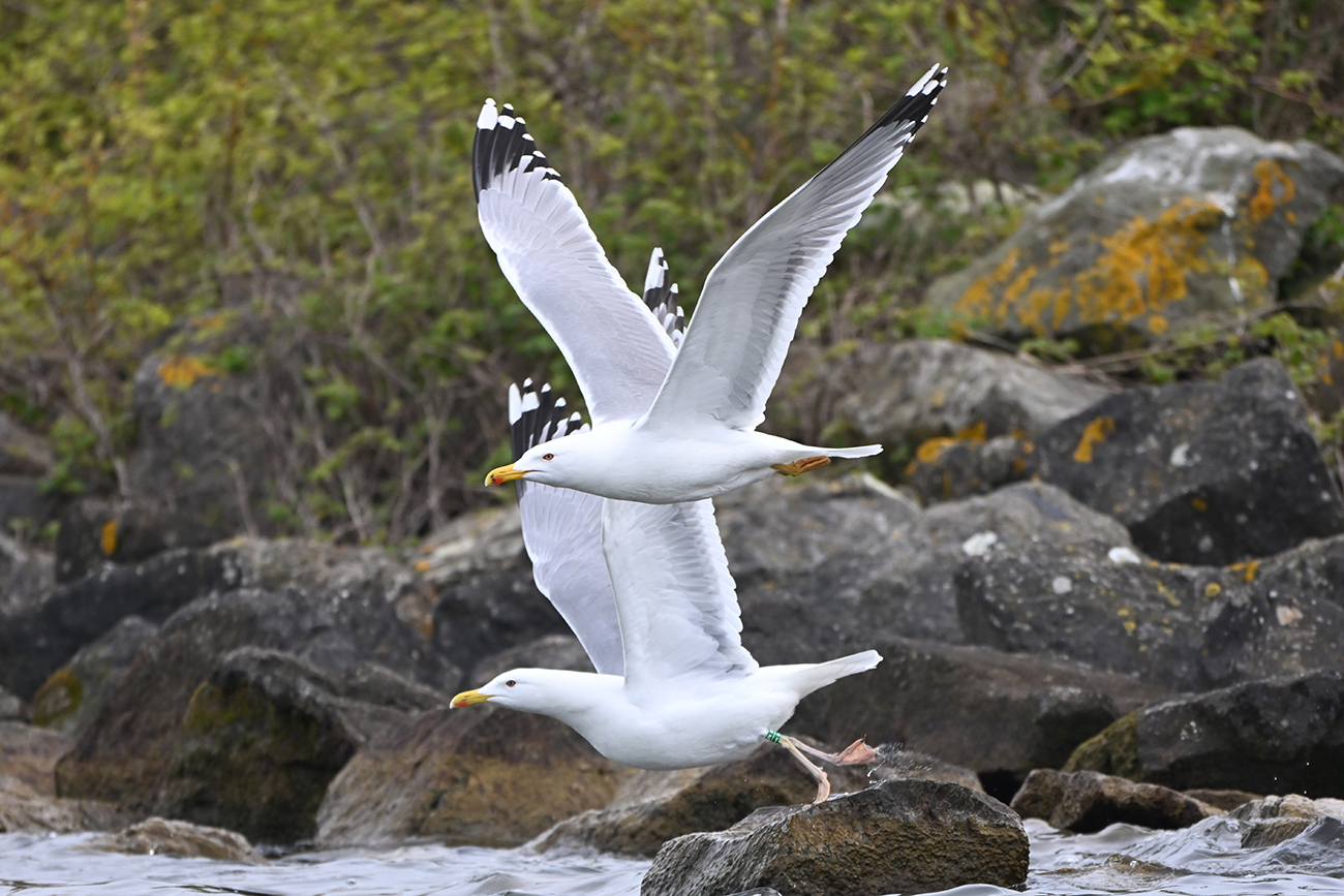 below: Caspian Gull cachinnans A|H adult & T|9 adult, April 13 2026, colony Lelystad, the Netherlands. Picture: Thijs Horst & Mars Muusse.