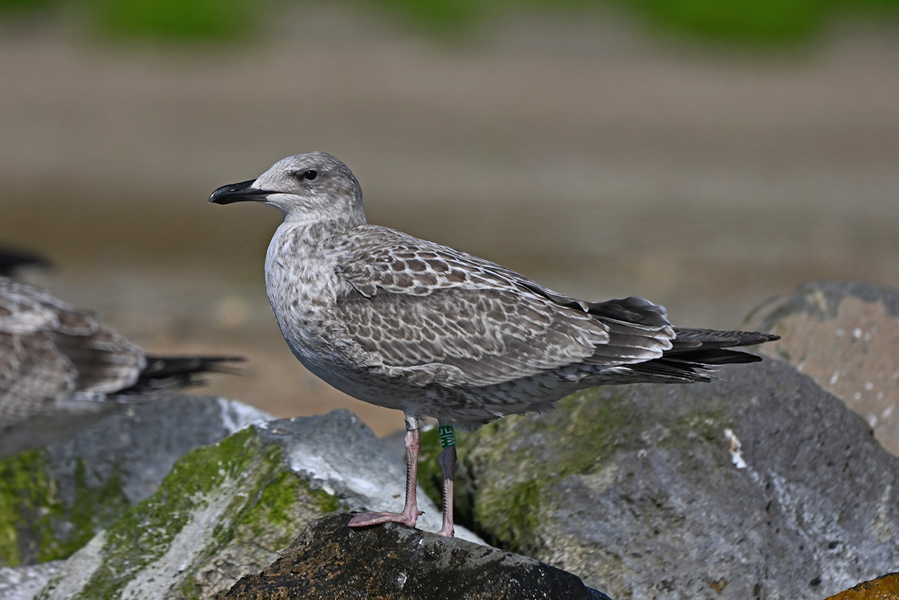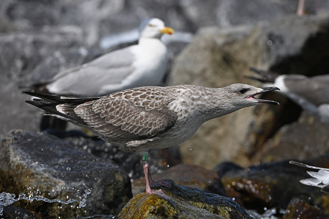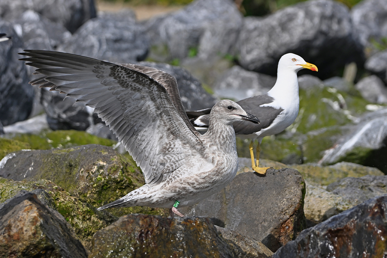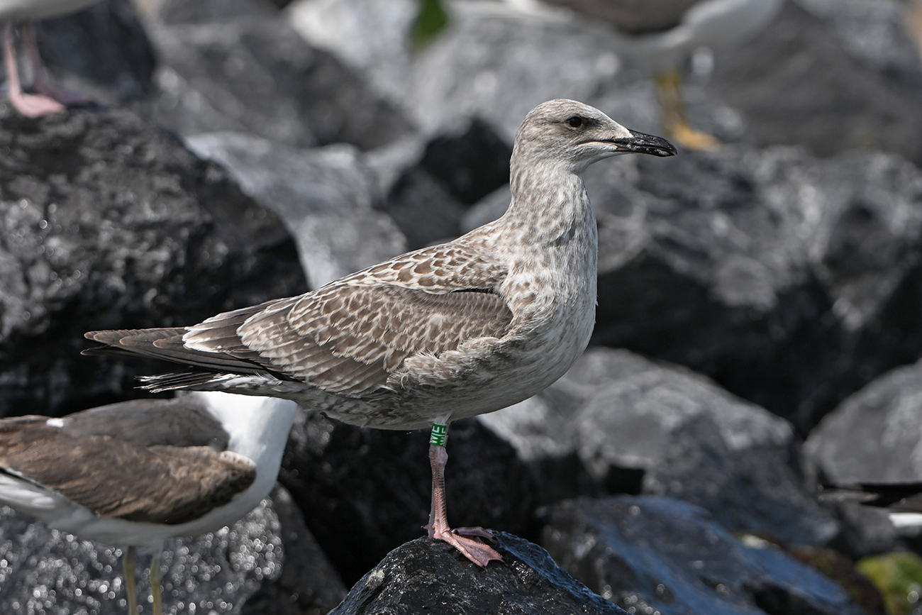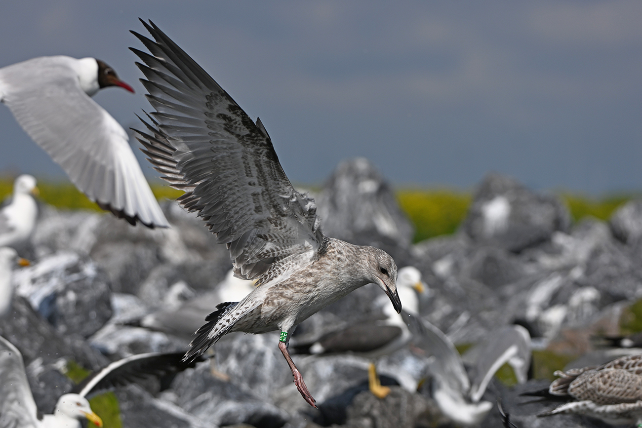 below: Caspian Gull cachinnans W|E 1CY, July 13 2025, colony De Kreupel, the Netherlands. Picture: Thijs Horst & Mars Muusse.