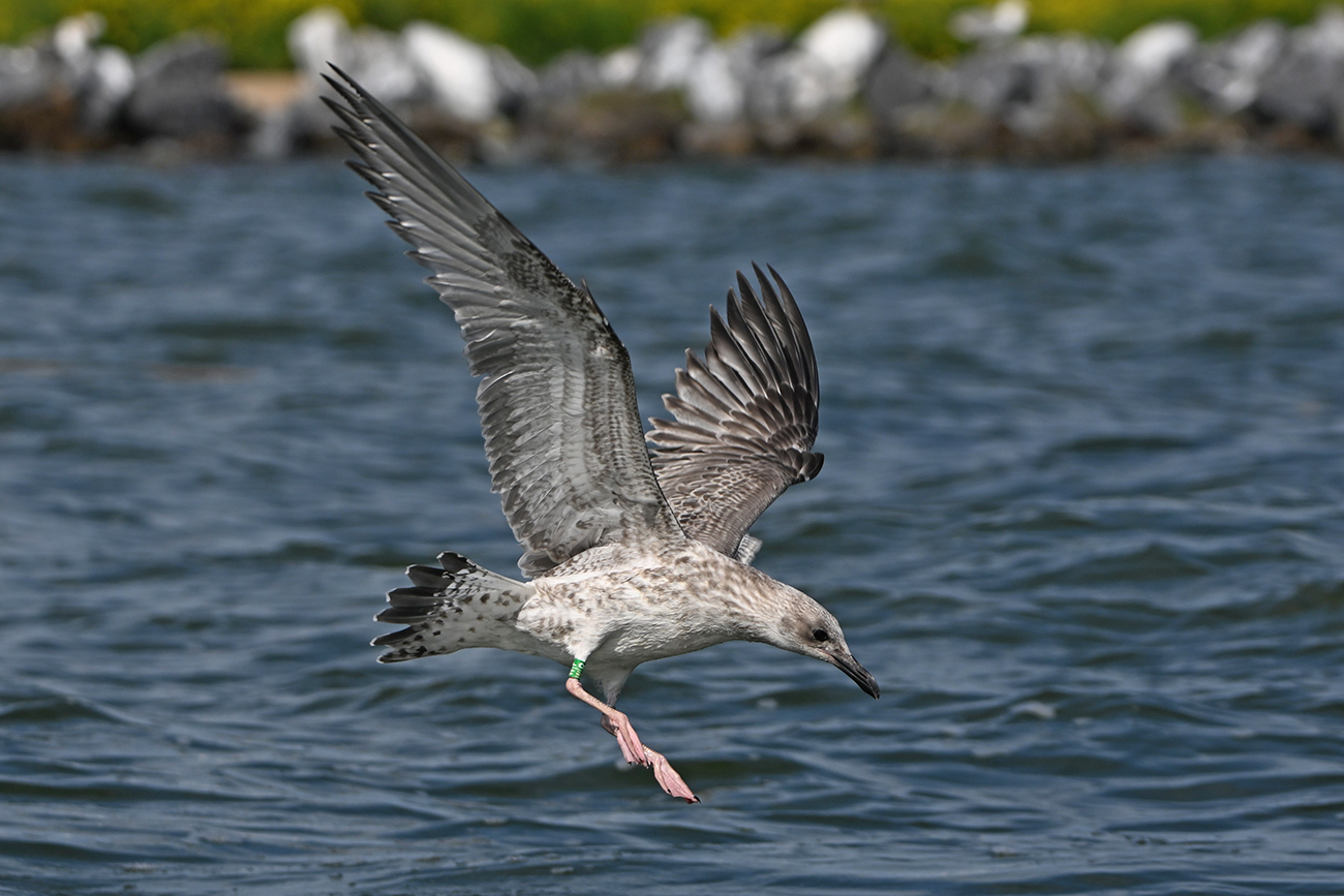 Tibia G-W|P and metal Arnhem NLA 5.639.147, ringed as pullus Larus cachinnans on May 09 2025 at IJsselmeer (De Kreupel), Holland (5247.00 N 513.00 E), by ringer Leon Kelder.