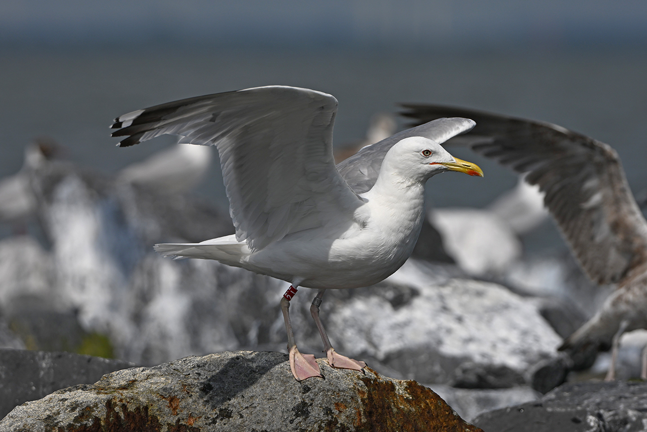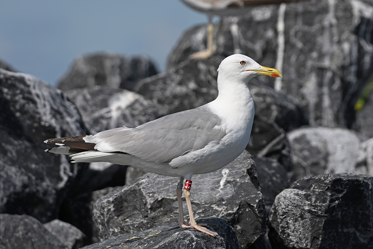 Tibia ring R-2L and metal NLA Arnhem 5.623.541, ringed as pullus Larus cachinnans on May 13 2022 at IJsselmeer (De Kreupel), Holland (5247.00 N 513.00 E) - ringer Leon Kelder.
