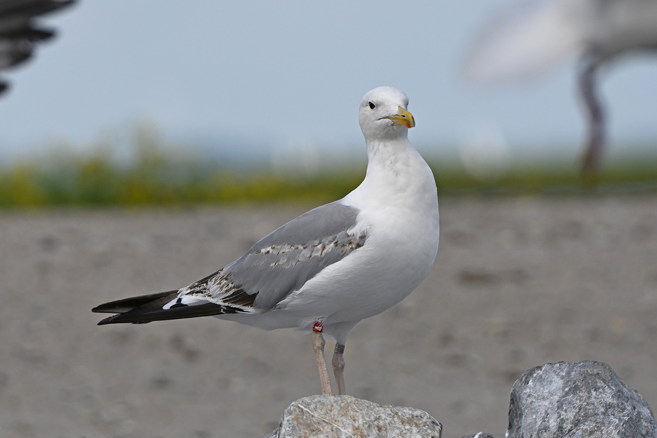 Red tibia ring r[4.5] and metal NLA 5.629.604, ringed as pullus Larus cachinnans on April 29 2023 at De Kreupel, Holland (5247.00 N 513.00 E) - ringer Leon Kelder.