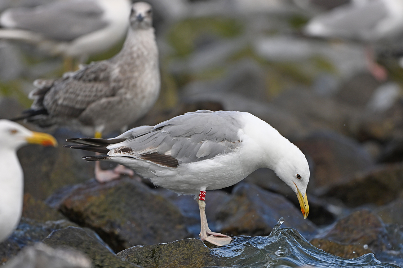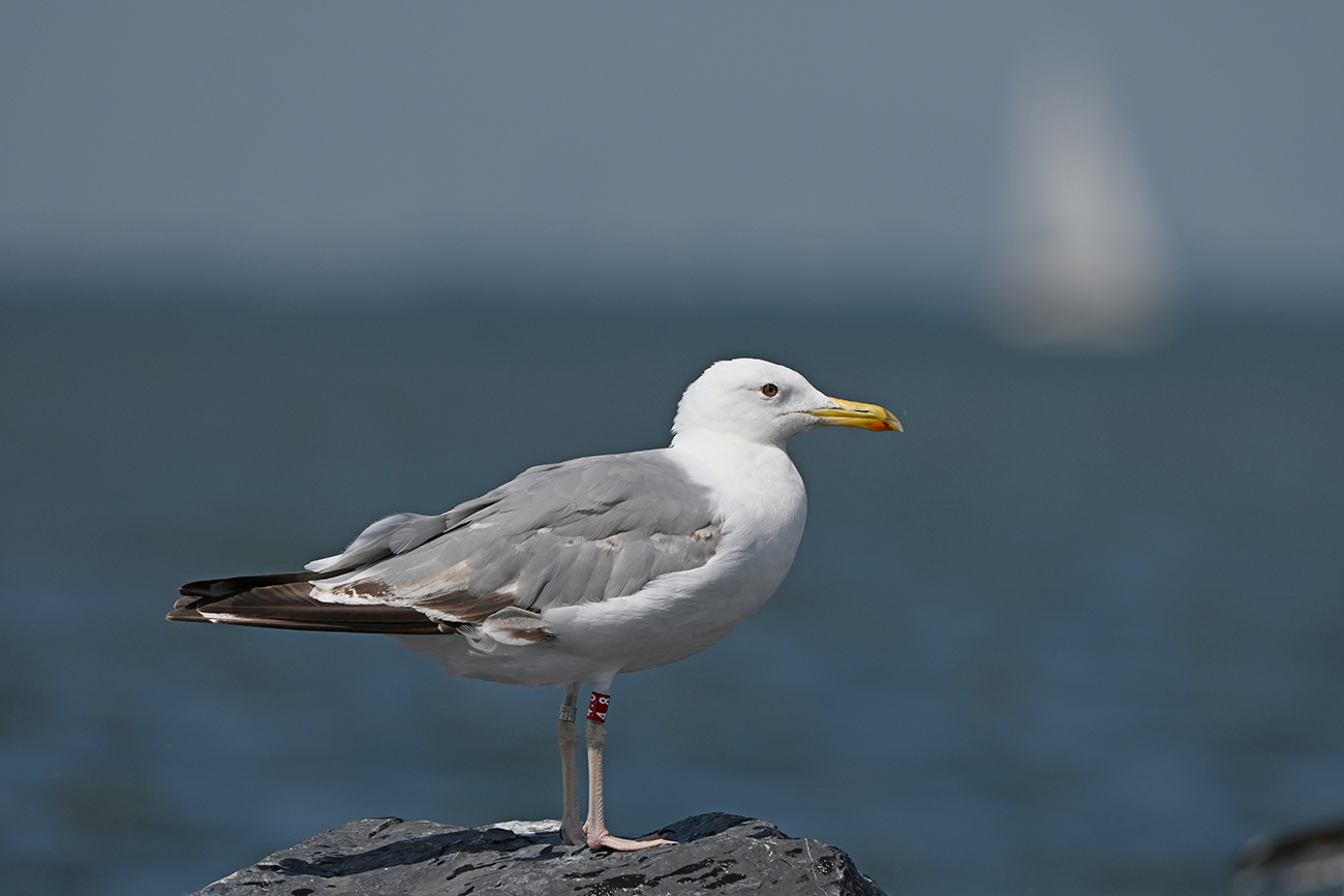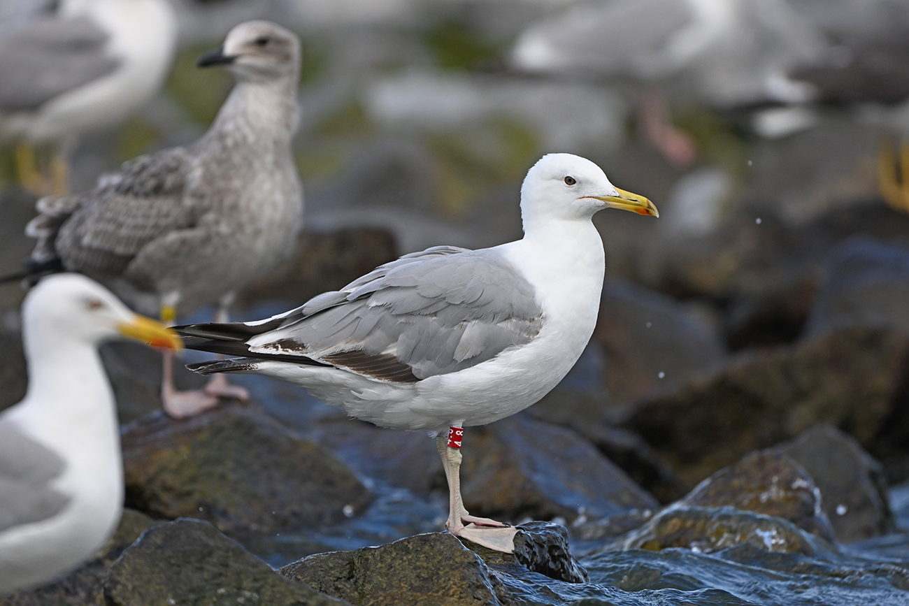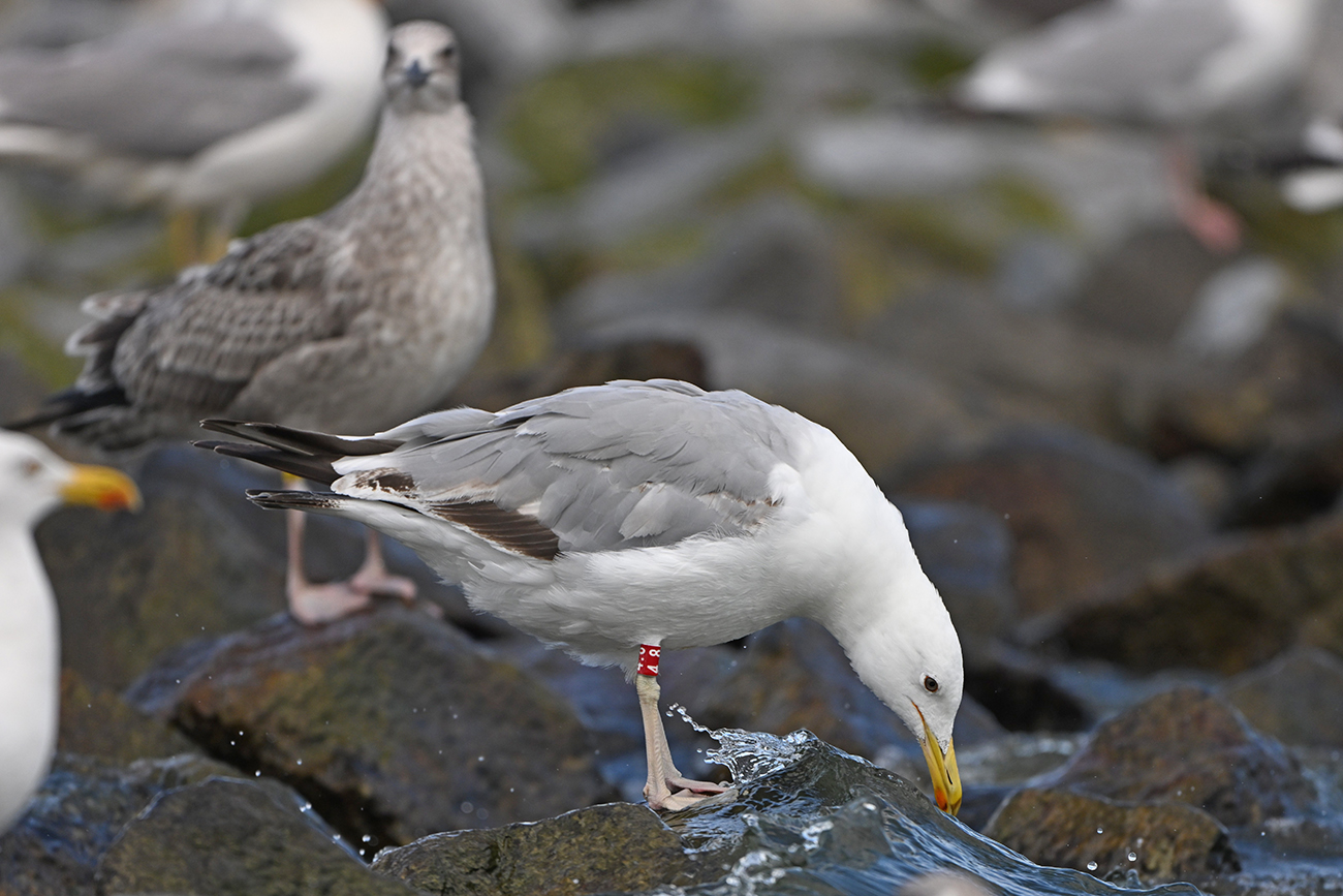 Caspian Gull cachinnans 4.8 1CY-3CY, 2023-2025, England & the Netherlands. Picture: Dante Shepherd, Thijs Horst & Mars Muusse.Red tibia ring r[4.8] and metal NLA 5.629.610, ringed as pullus Larus cachinnans on May 12 2023 at De Kreupel, Holland (5247.00 N 513.00 E) - ringer Leon Kelder. Recoveries: below: Caspian Gull cachinnans 4.8 3CY, July 13 2025, colony De Kreupel, the Netherlands. Picture: Thijs Horst & Mars Muusse.below: Caspian Gull cachinnans 4.8 1CY, August 17 2023, Greenwich - London, England. Picture: Dante Shepherd. |