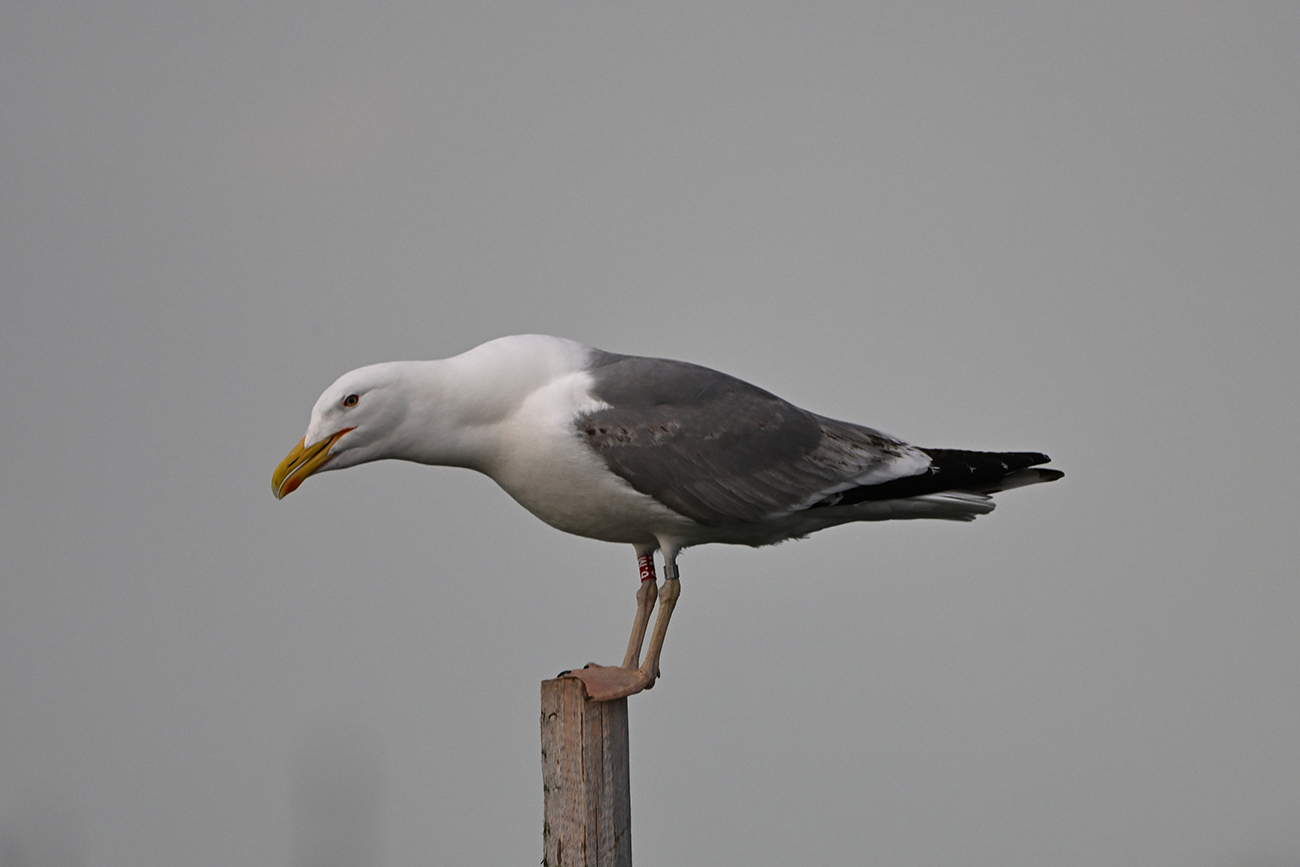 Red tibia ring r[6.M] and metal NLA 5.625.164, ringed as pullus Larus cachinnans at nest 139 on May 22 2022 in colony Lelystad, the Netherlands. Ringer: Jeroen Nagtegaal.