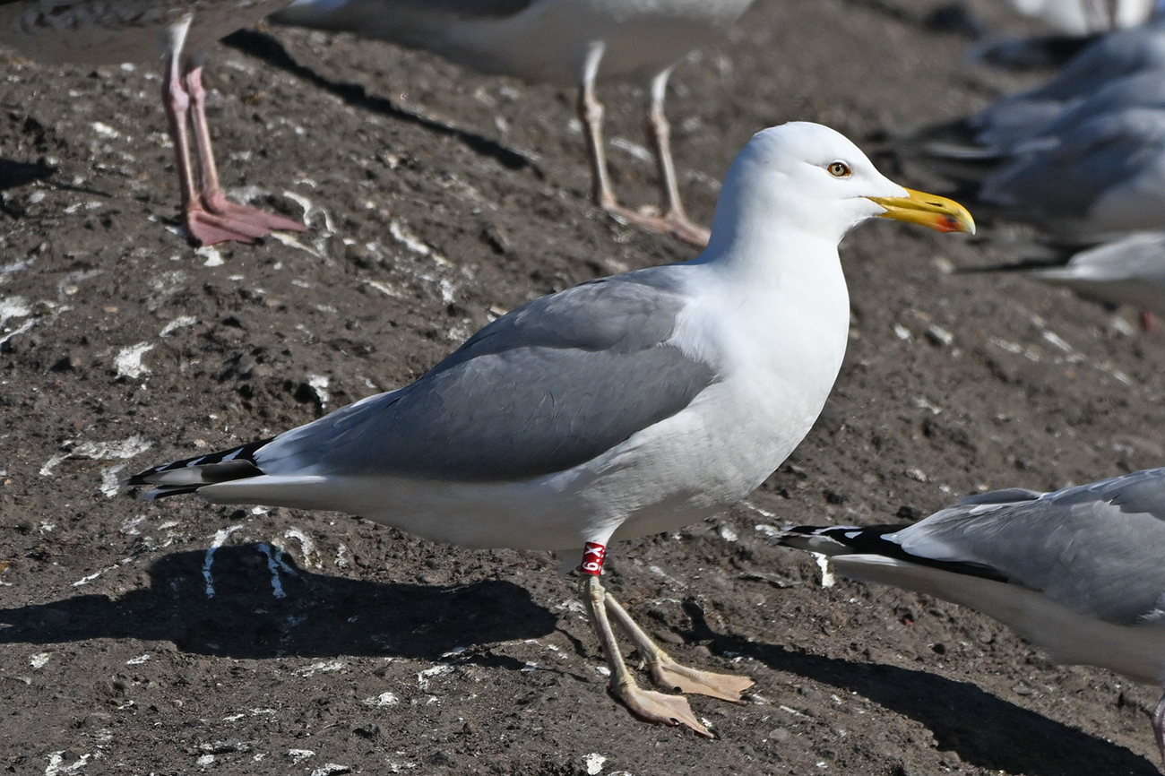 Red tibia ring r[6.X] and metal NLA 5.625.175, ringed as pullus F1 hybrid L. argentatus x L. cachinnans at nest 48 on May 30 2022 in colony Lelystad, the Netherlands. Ringer: Albert de Jong / Roland-Jan Buijs ringing team.