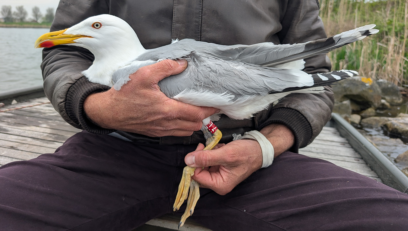 Red tibia ring r[7.L] and metal NLA 6.214.904, ringed as breeding adult male Larus cachinnans-type at nest 62 on May 03 2023 in colony Lelystad, the Netherlands. Ringer: Roland-Jan Buijs.