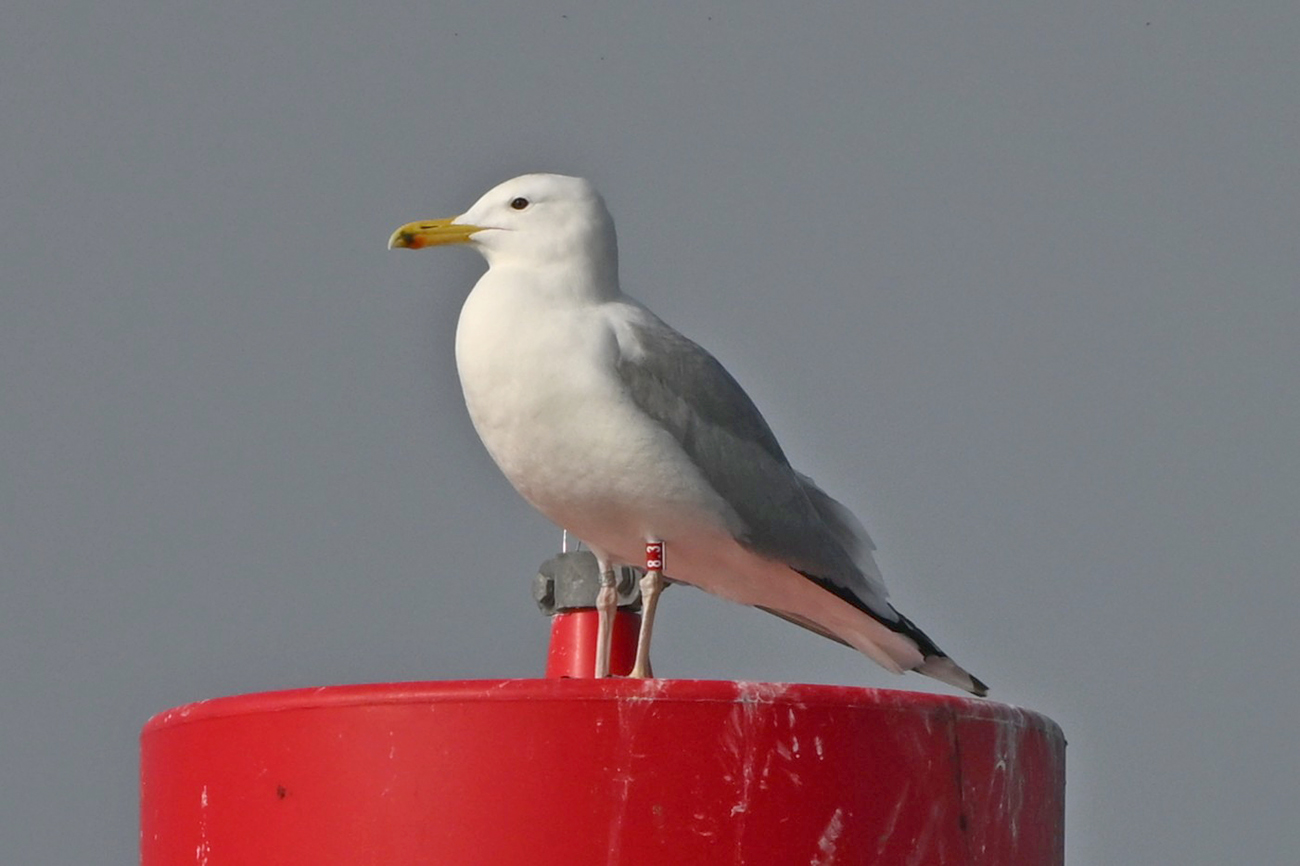 Tibia ring R-8.3 and metal NLA 5.556.478, ringed as pullus Larus cachinnans on May 11 2023 in nest P:U60 at Lelystad, the Netherlands. Ringed by Roland-Jan Buijs ringing team.