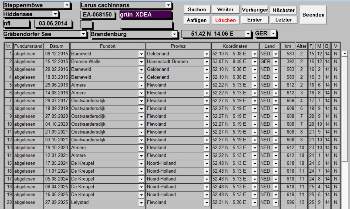 Caspian Gull cachinnans XDEA 11CY-12CY, 2024-2025, colony De Kreupel, the Netherlands. Picture: Thijs Horst & Mars Muusse.Green tarsus XDEA, ringed as pullus in 2014 in Germany. Close to pure Caspian Gull, although pattern on P10 could be better. below: Caspian Gull cachinnans XDEA 12CY, April 08 2025, colony De Kreupel, the Netherlands. Picture: Thijs Horst & Mars Muusse.below: Caspian Gull cachinnans XDEA 11CY, August 05 2024, colony De Kreupel, the Netherlands. Picture: Thijs Horst. |
