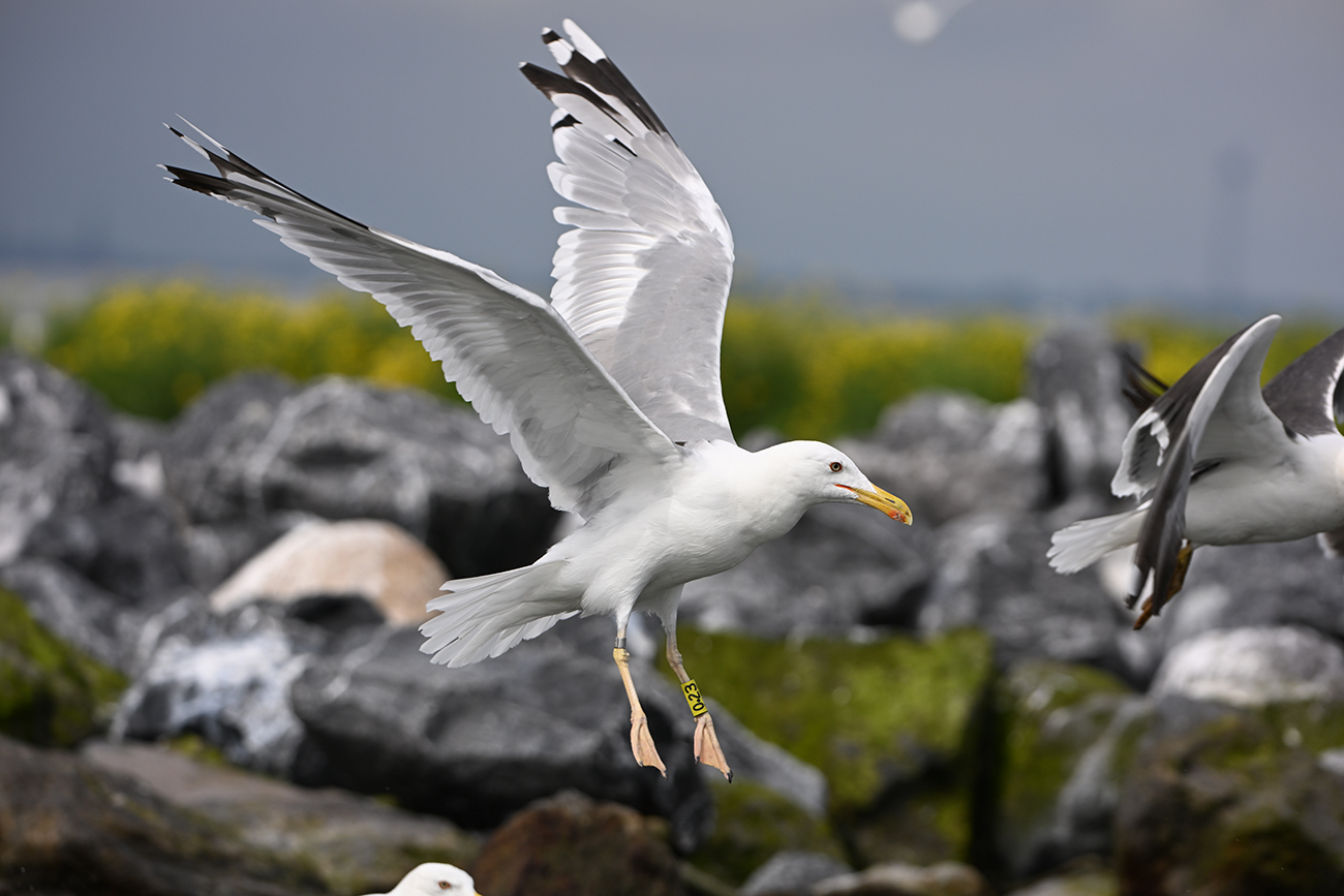 Caspian Gull cachinnans 0.23 adult, 2024-2025, colony De Kreupel, the Netherlands. Picture: Thijs Horst & Mars Muusse.Tarsus ring y-0.23, ringed as breeding adult Larus cachinnans on April 26 2024 at De Kreupel - island Q, the Netherlands (5247.00 N 513.00 E). Ringer Kees Camphuysen & Leon Kelder. Recoveries: