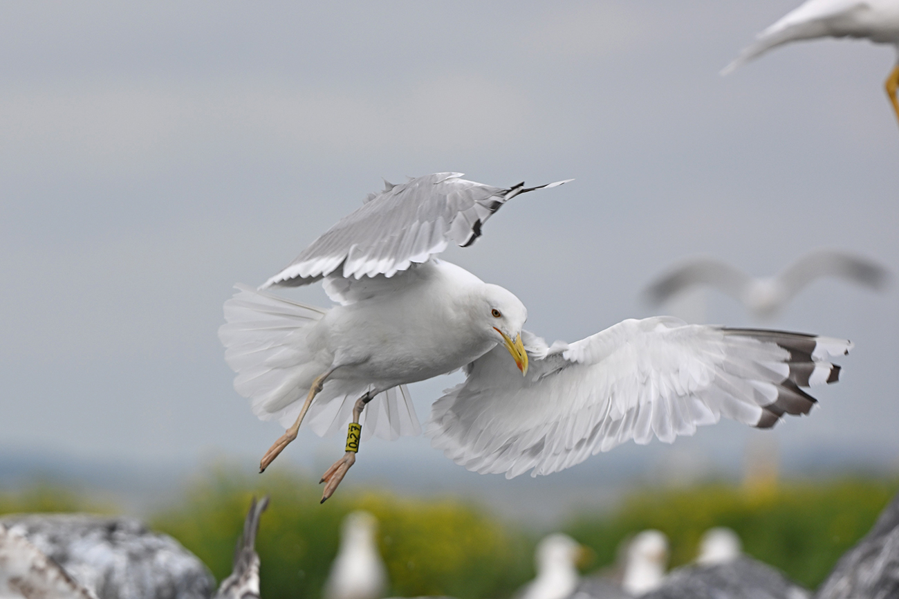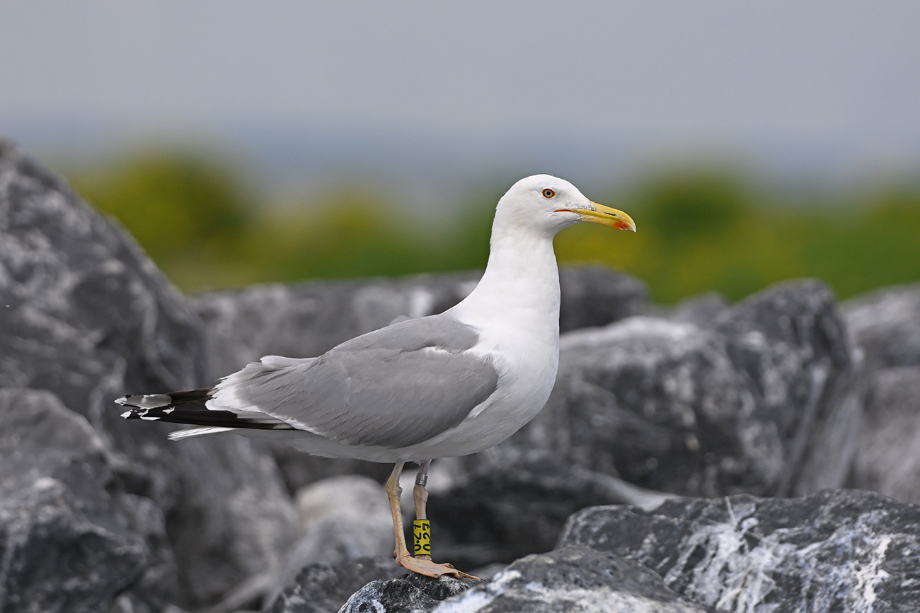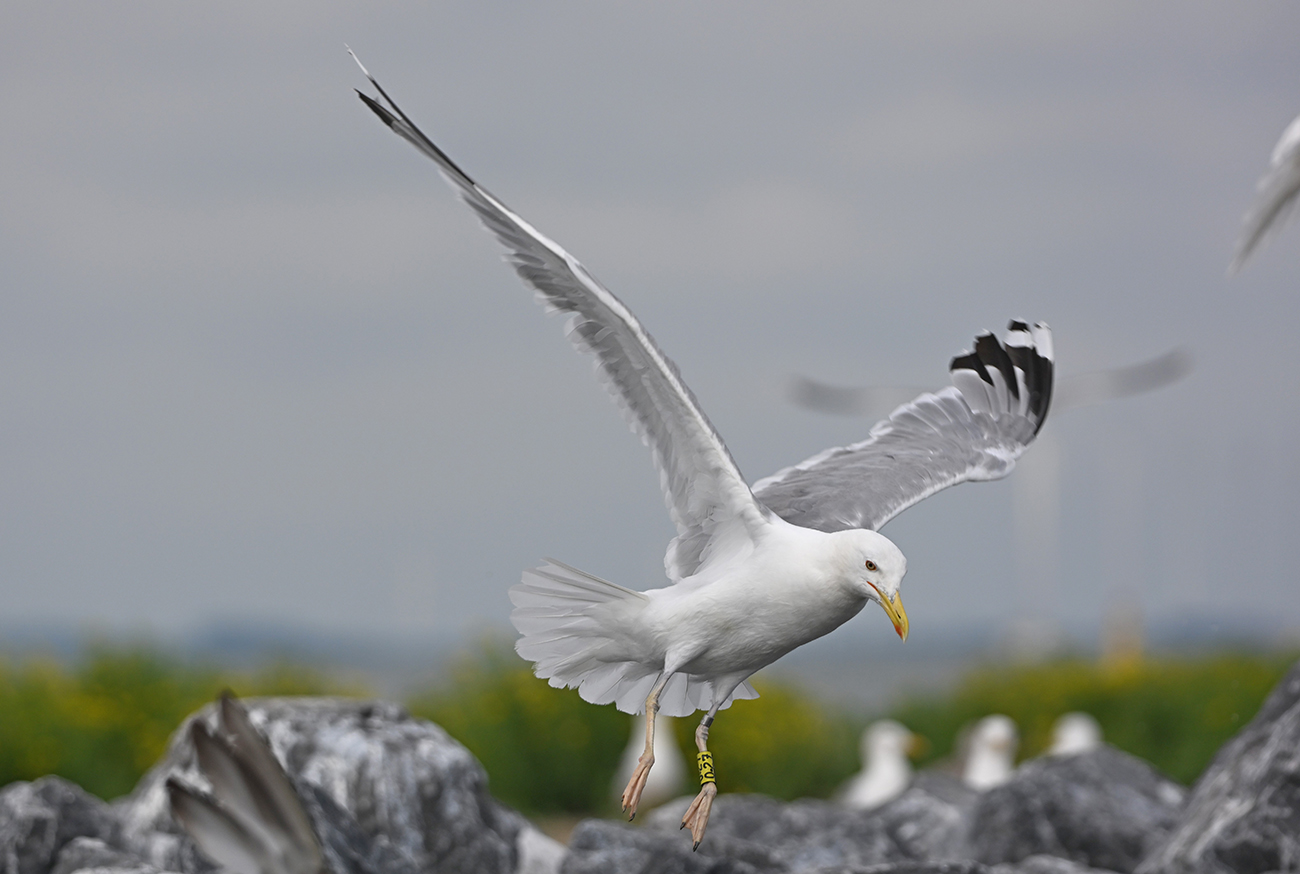Caspian Gull cachinnans 0.27 adult, July-August 2024, colony De Kreupel, the Netherlands. Picture: Thijs Horst & Mars Muusse.Tarsus ring y-0.27, ringed as breeding adult Larus cachinnans on May 03 2024 at De Kreupel - island Q, the Netherlands (5247.00 N 513.00 E). Ringer Kees Camphuysen & Leon Kelder. Recoveries: