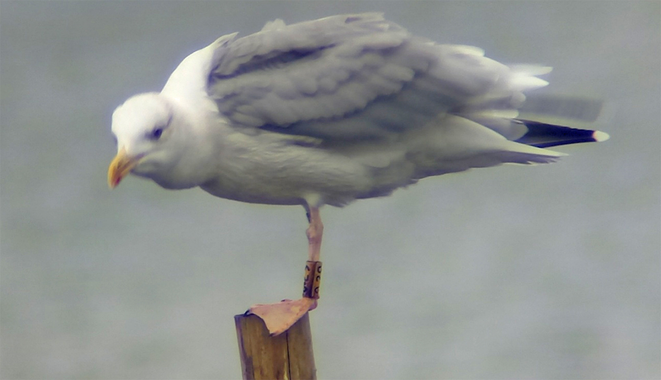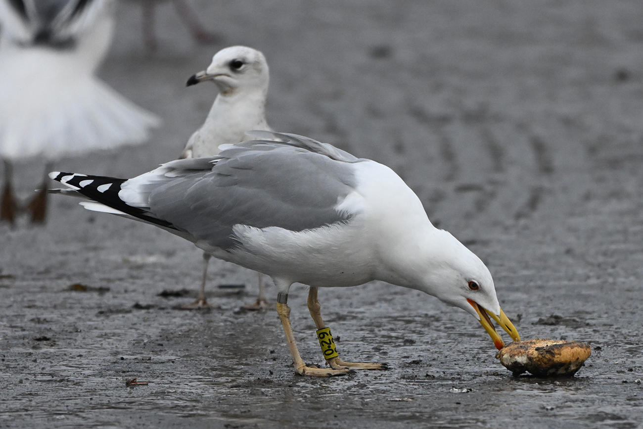 Caspian Gull cachinnans 0.29 adult, 2025 - 2026, the Netherlands. Picture: Thijs Horst & Hans van Muiswinkel..Tarsus ring y-0.29 and logger #6514, ringed as breeding adult Larus cachinnans on April 25 2025 at De Kreupel, the Netherlands (5247.00 N 513.00 E).